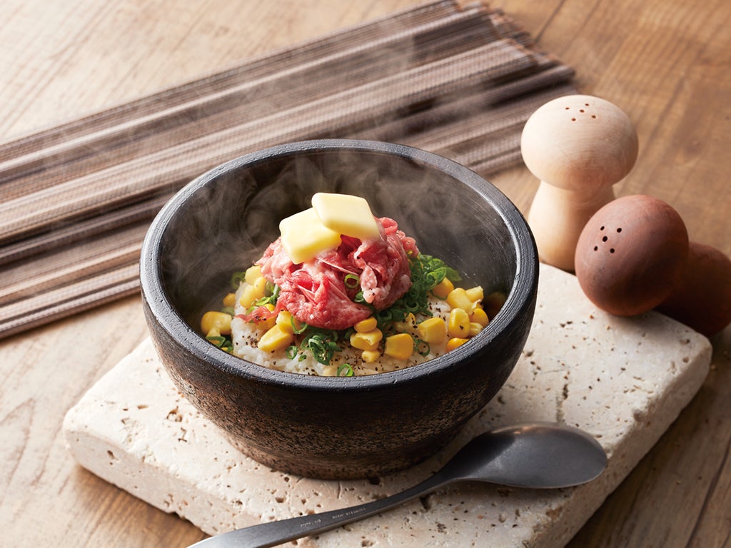 コーンと国産牛をふんだんに使用しました。熱々の石鍋が醤油とバターの香ばしさを際立たせ、止まらない美味しさです。