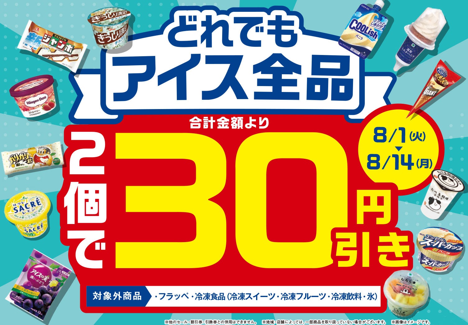 気象庁の発表によると、本年の8月の気温は全国的に平年よりも高くなり、厳しい暑さになると予想されます。ファミリーマートでは、お客さまに少しでも暑い夏を快適に過ごしていただけるように、アイスをどれでも2個お買い上げごとに、合計金額から30円引きとなるおトクなキャンペーンを実施いたします。