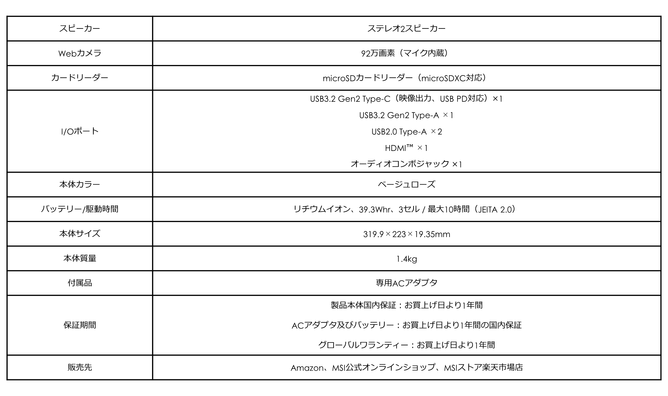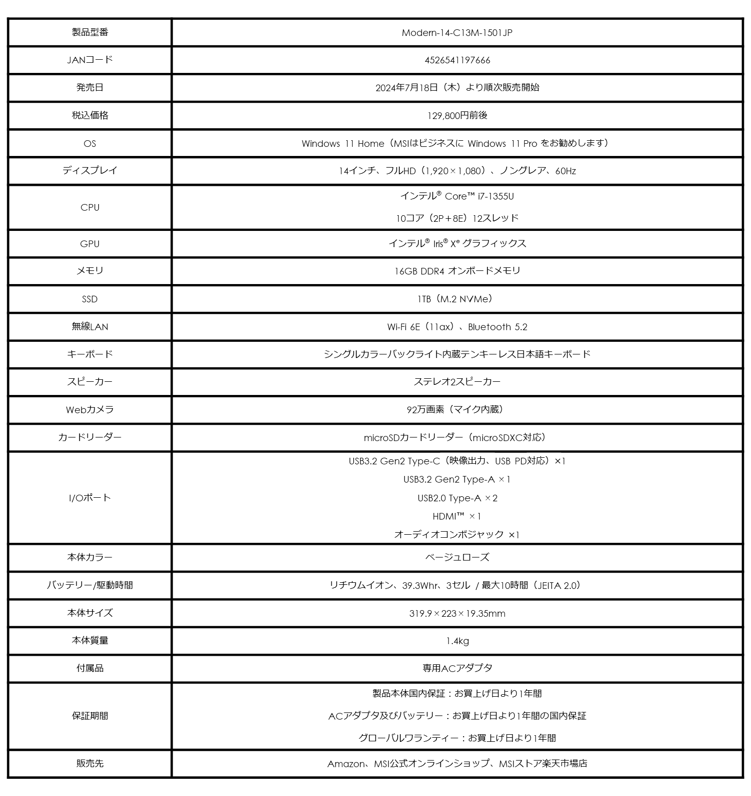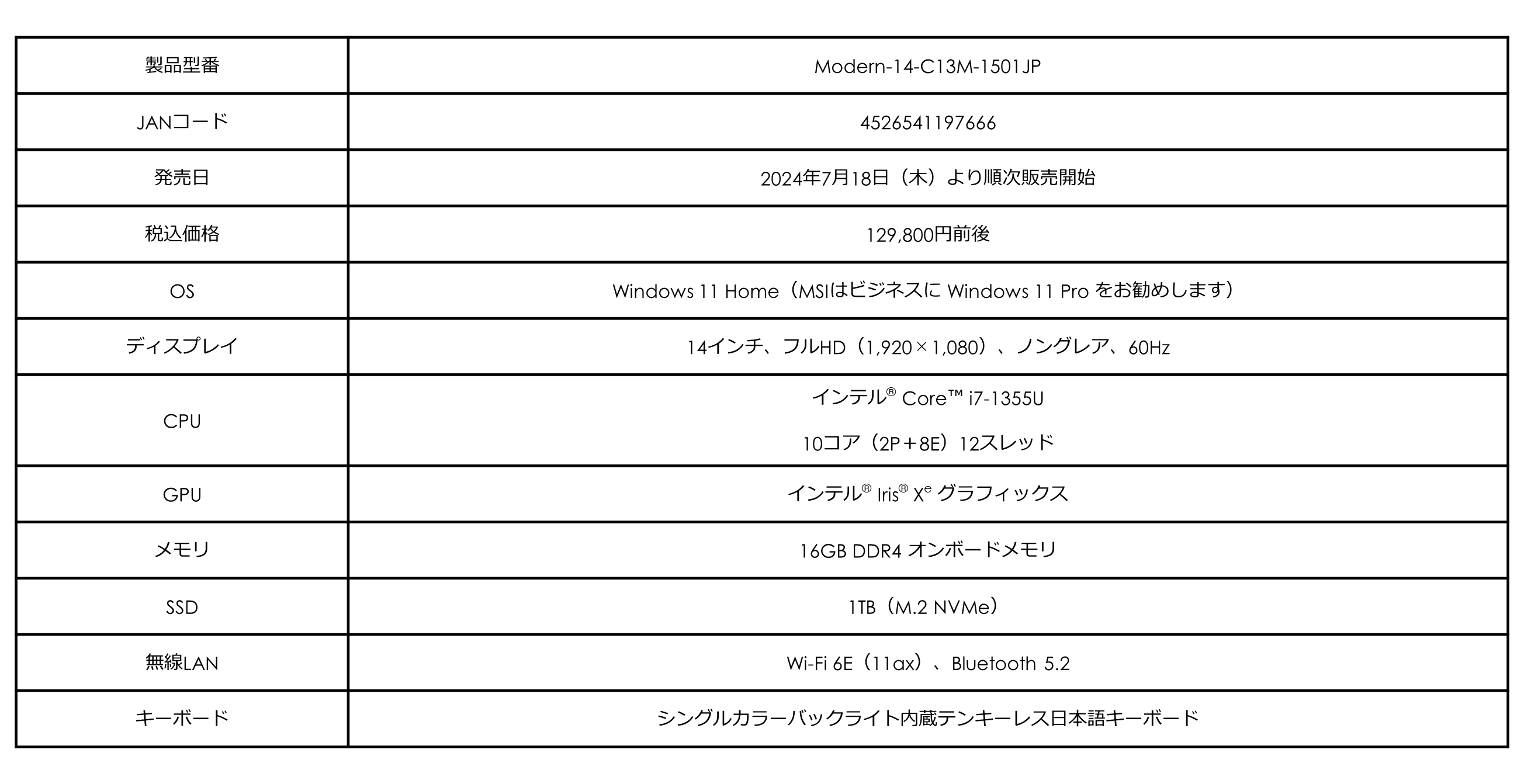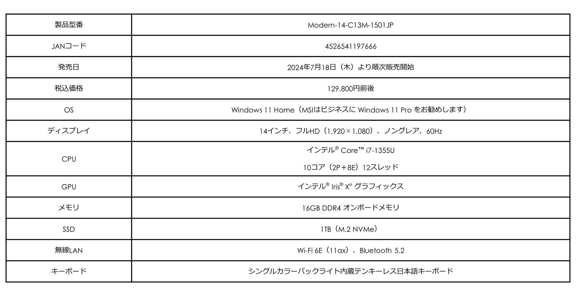 ・Modern 14 C13M 製品ページ:https://jp.msi.com/Business-Productivity/Modern-14-C13X
