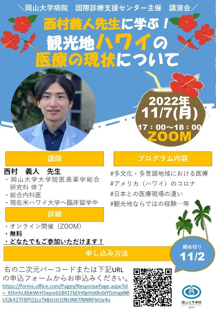 【岡山大学】岡山大学病院国際診療支援センター講演会「西村義人先生に学ぶ!観光地ハワイの医療の現状について」〔11/7月, オンライン〕
