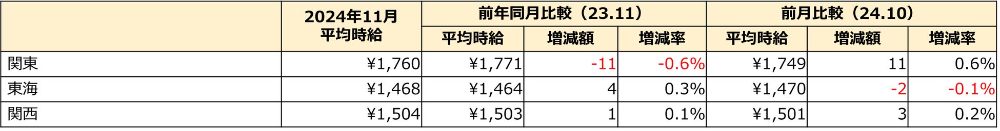 11月度のエリア別平均時給は、東海、関西で前年同月比プラス。