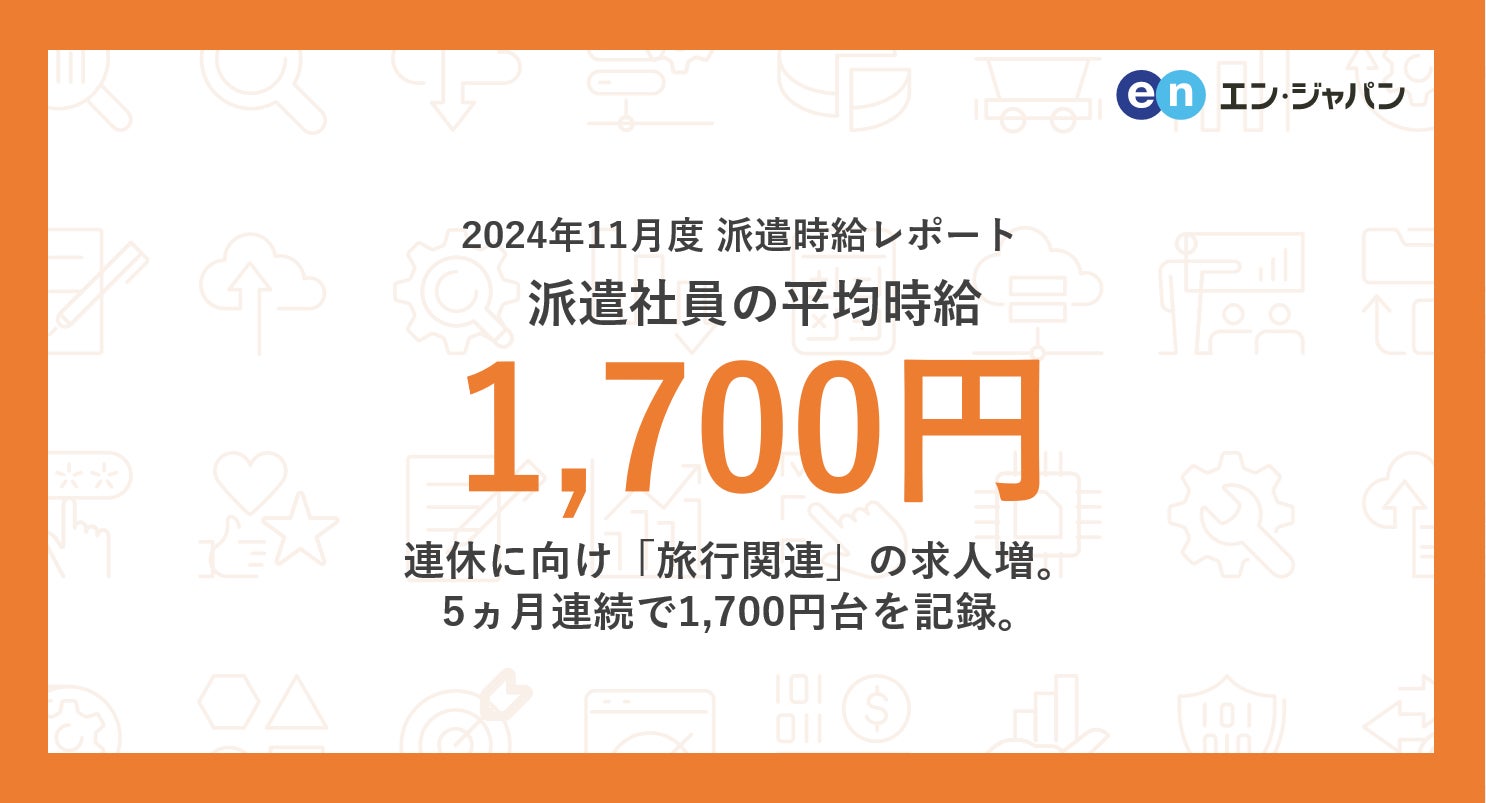 2024年11月度 派遣社員の平均時給は1,700円連休に向け「旅行関連」の求人増。5ヵ月連続で1,700円台を記録。