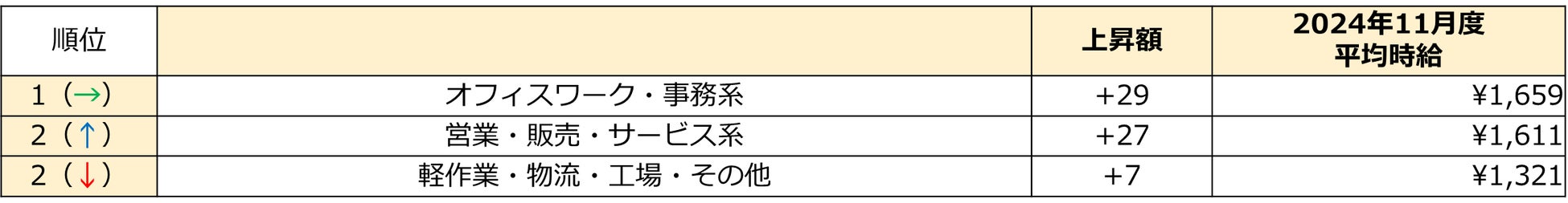 11月度の職種別/前年同月比 時給上昇額ランキング