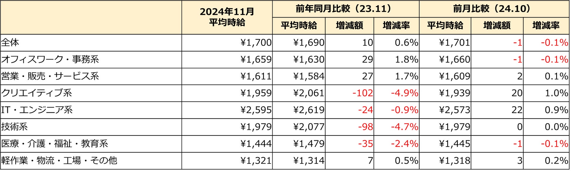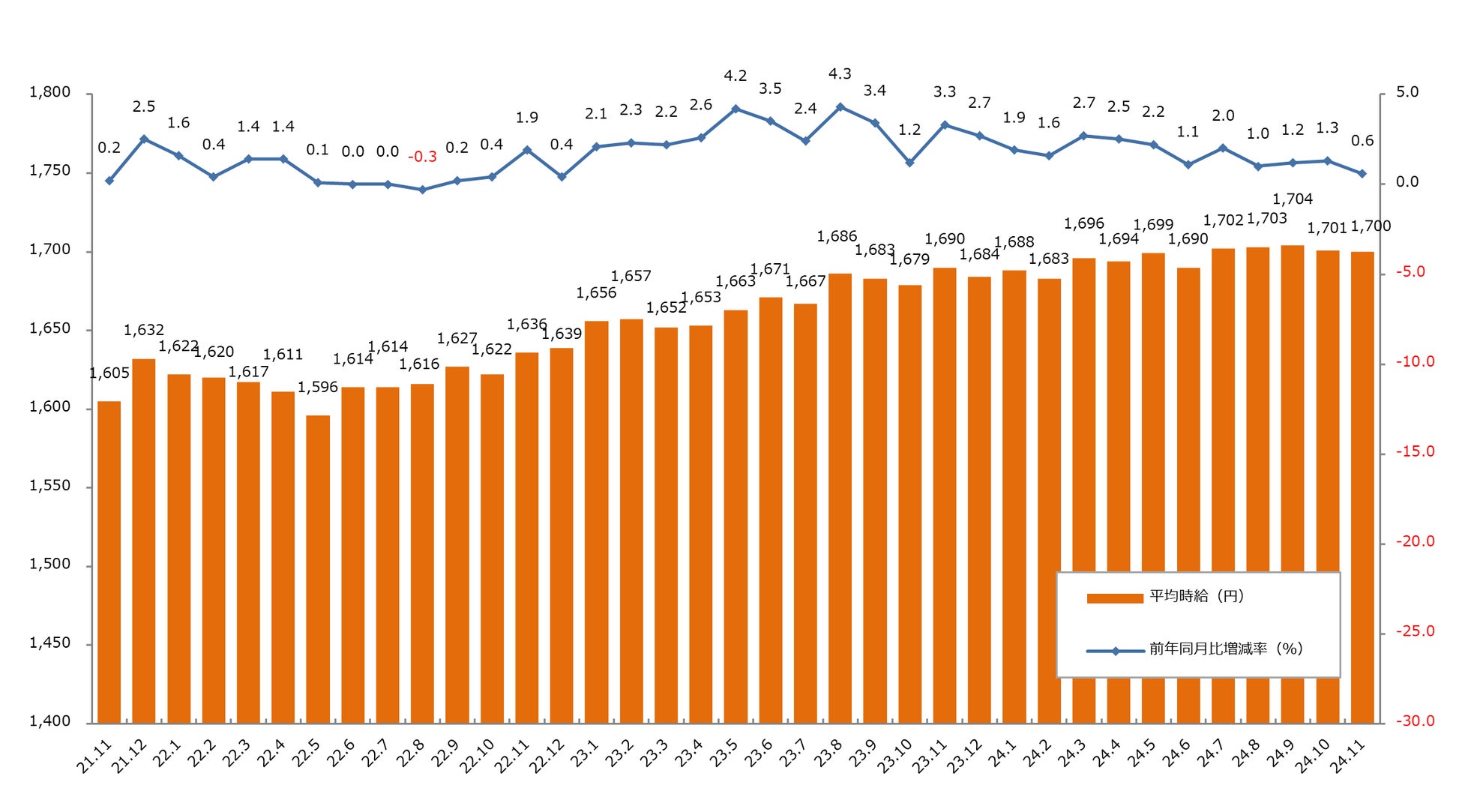 2024年11月度の三大都市圏平均時給は1,700円(前月比-1円・0.1%減、前年同月比+10円・0.6%増)で、5ヵ月連続で1,700円台を記録。前年同月を上回るのは27ヵ月連続です。