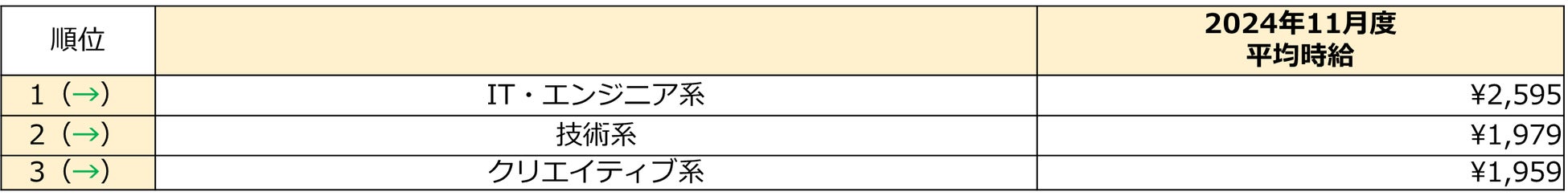 職種別では、オフィスワーク・事務系、時給1,659円(前月比-1円、前年同月比+29円)で高時給を記録。2024年の年末年始は9連休の方が多く、旅行会社での入力や顧客対応を行なう、旅行関連の求人が多数登場。そのほか、「通訳・翻訳」の時給も上昇。アジア圏の企業が参入している背景から、中国語を使う集客難度の高い求人が増えており、時給の上昇をけん引しました。