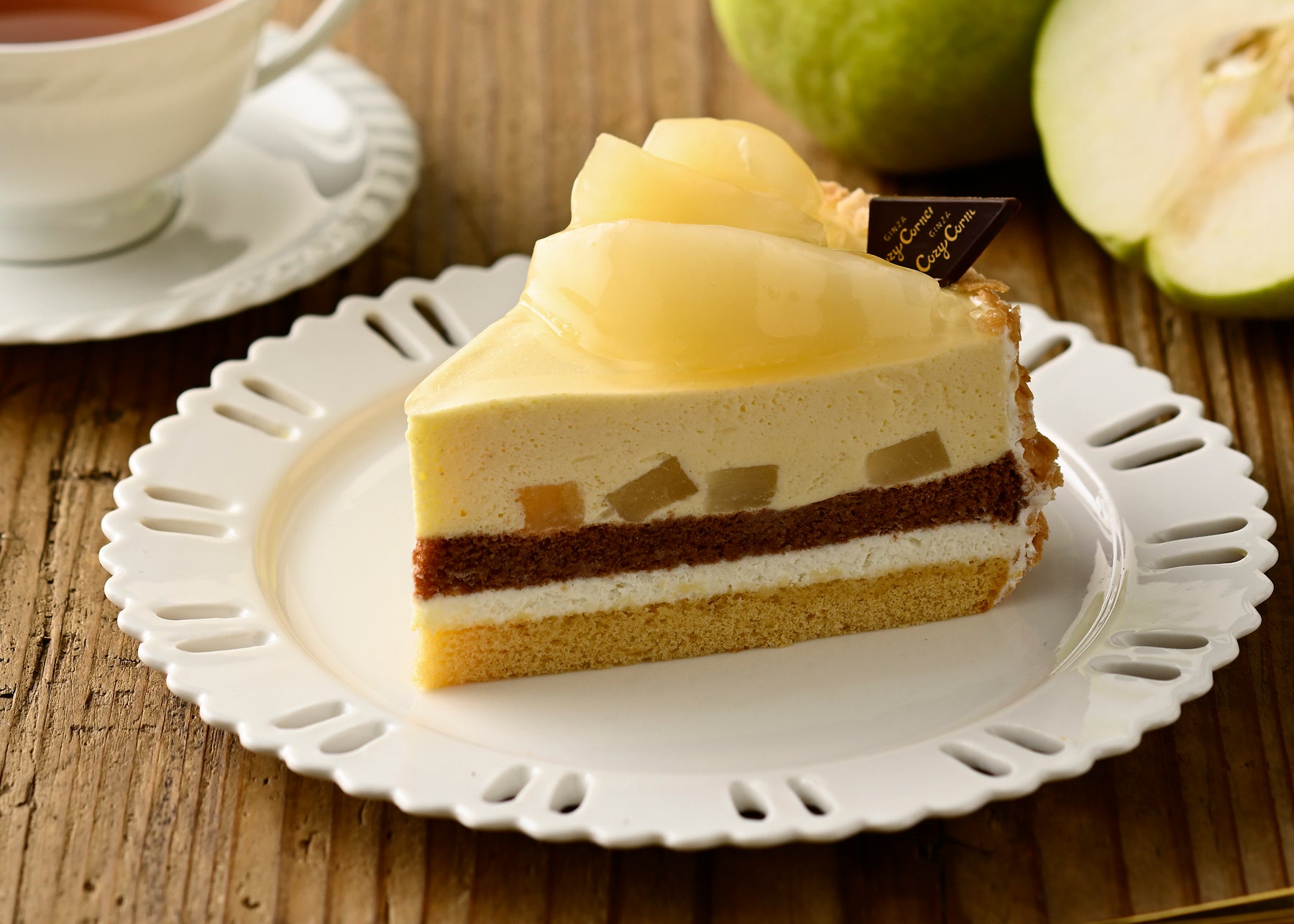 洋梨の上品な甘みと香りを楽しめる季節限定のショートケーキです。洋梨と相性のよい、キャラメルスポンジとチョコスポンジに、洋梨のクリームと、洋梨の果肉入りムースを重ね、洋梨をたっぷりと飾りました。