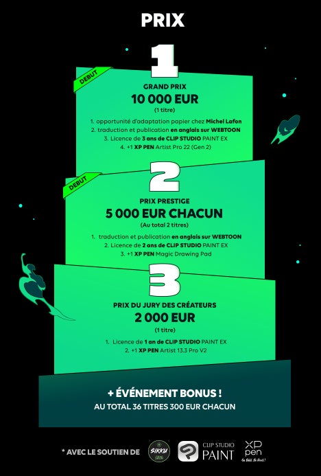 グランプリには10,000ユーロの賞金や「WEBTOON FRANCE」との契約、フランスの大手出版社「Michel Lafon」での掲載の機会が提供されます。また、グランプリ、準グランプリには、WEBTOON®で英語版の作品が掲載され、英語圏に向けてよりグローバルに展開することができます。