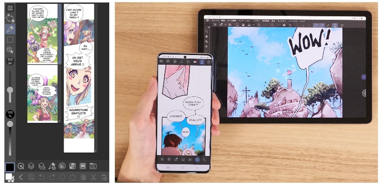 「CLIP STUDIO PAINT」は、デジタルでのイラスト、マンガ、Webcomic、アニメーション制作に最適なアプリです。縦長のWebcomic原稿の制作はもちろん、PCやタブレットで制作中のWebcomic作品の見映えをスマートフォンで確認できる機能など、Webcomicクリエイターを支援するさまざまな機能を提供しています。