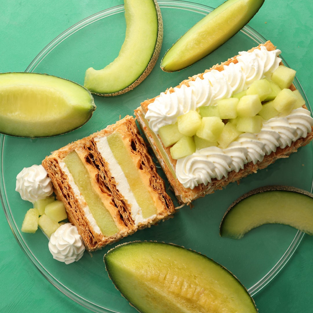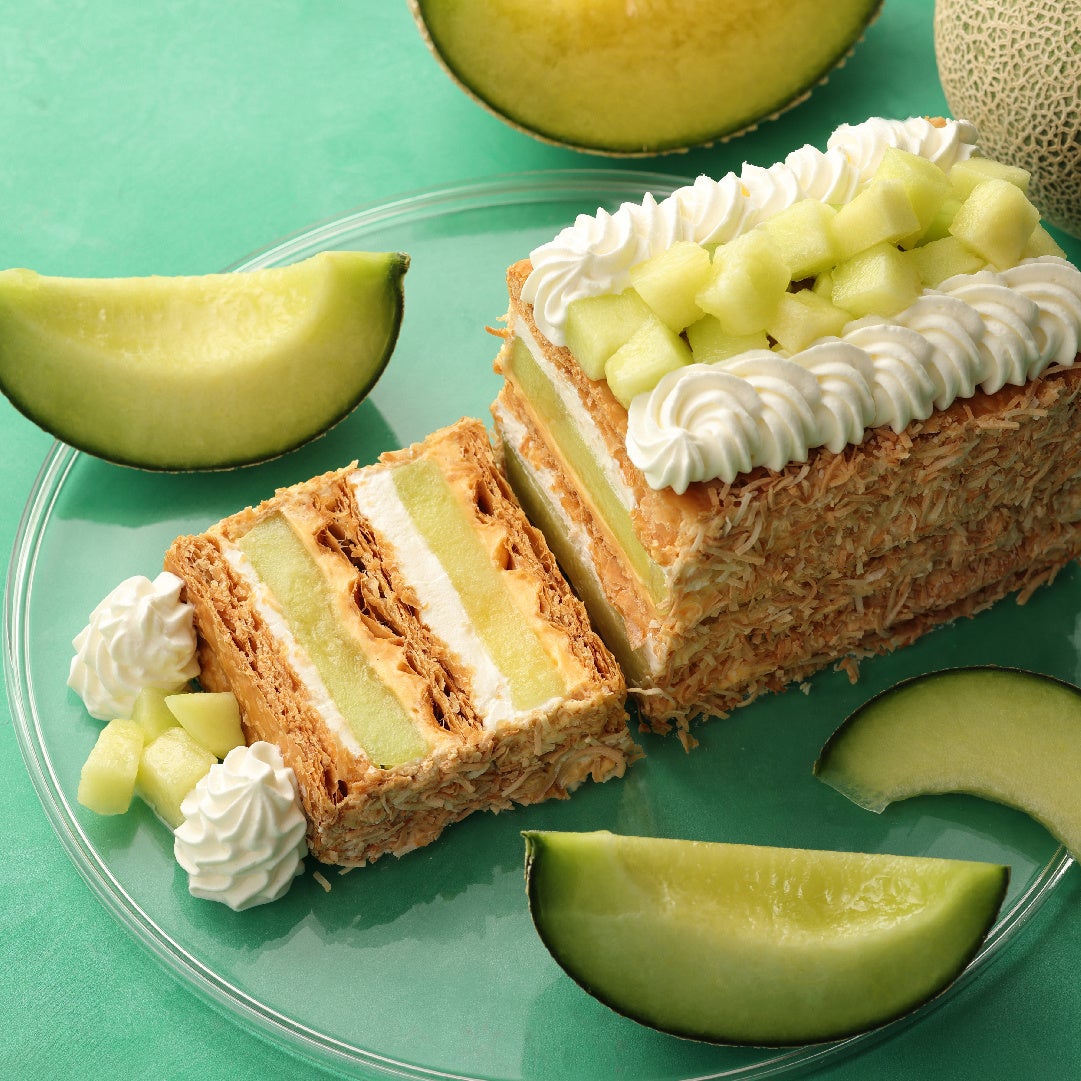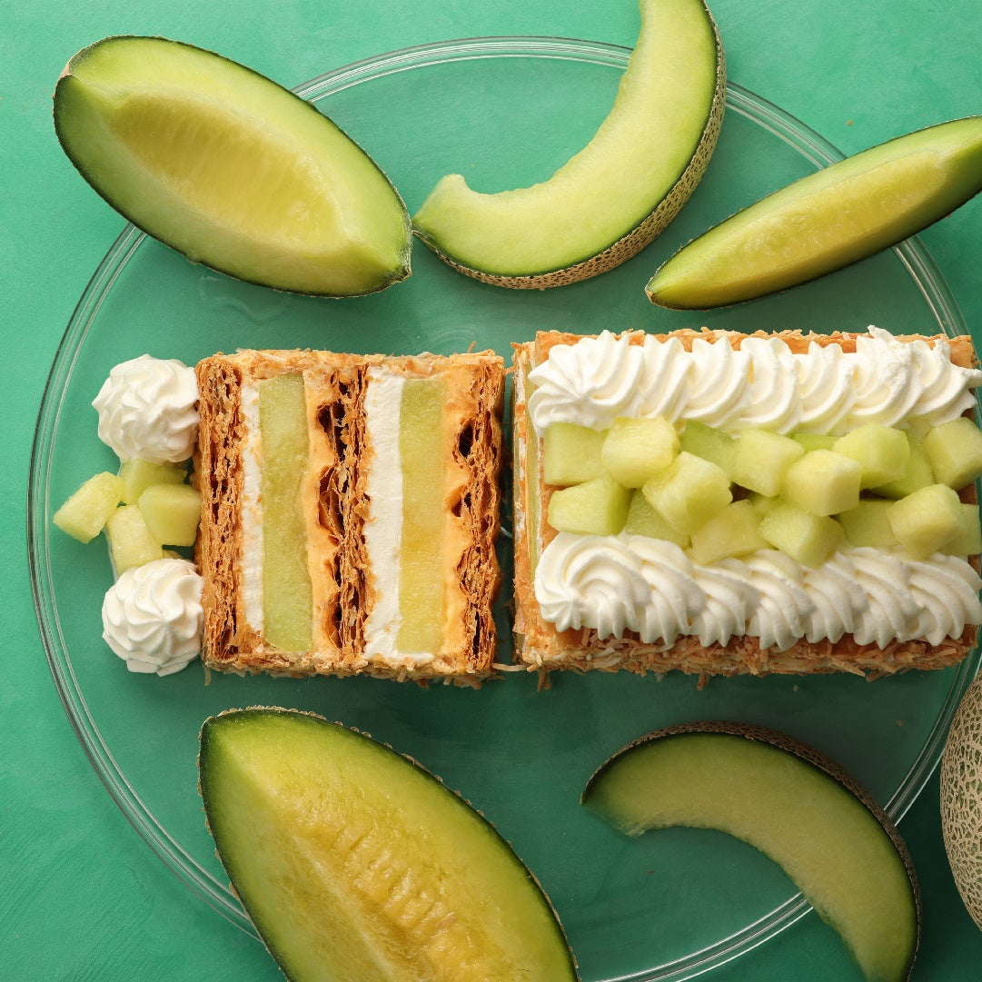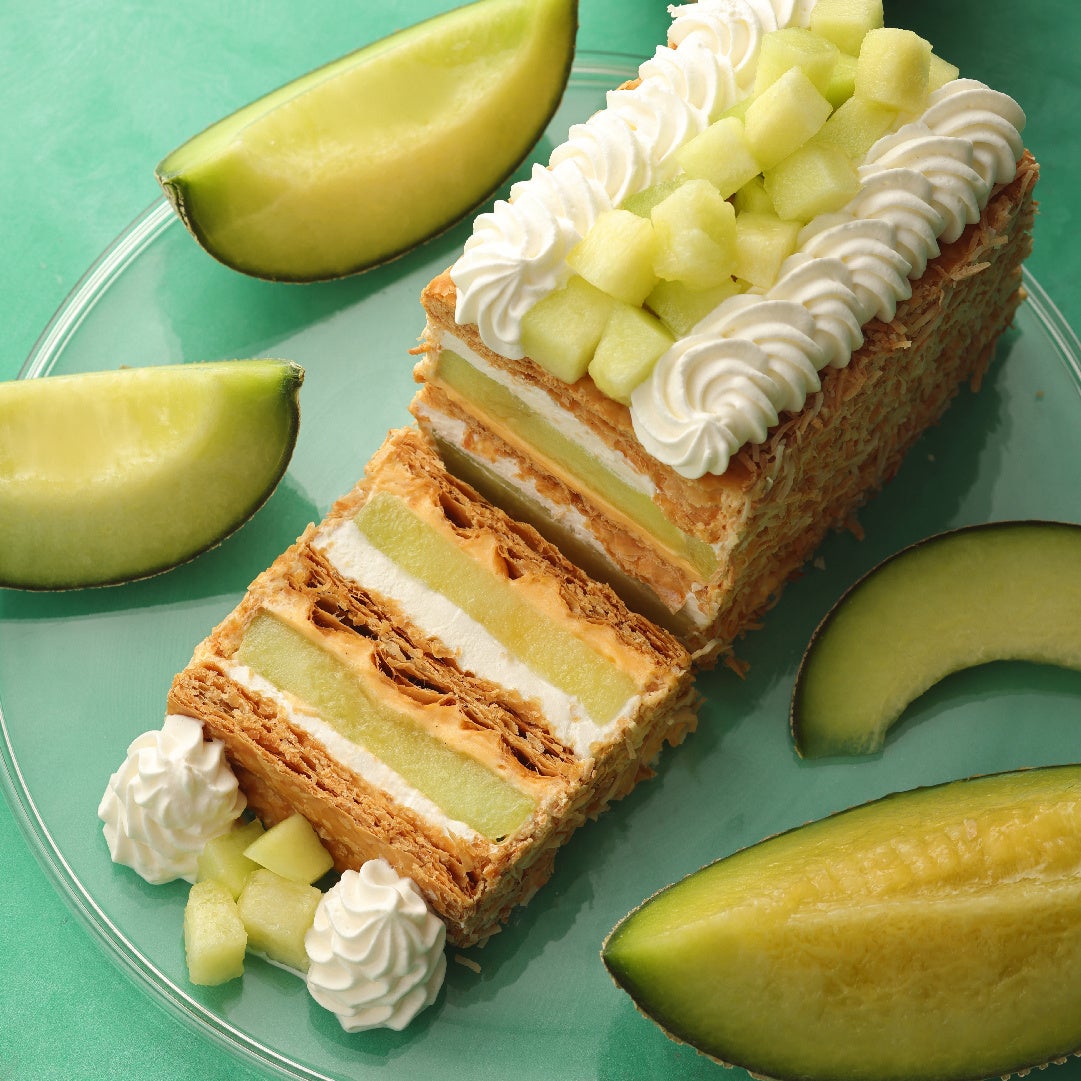 キハチを代表するデザート“ナポレオンパイ”を旬の素材でアレンジし、季節ごとの味わいを提案する<キハチのパイシリーズ>。今回はメロン生産量26年連続日本一(※1)を誇る茨城県で生まれた、爽やかな甘さとなめらかな果肉の“イバラキング”を楽しむ特別なパイが青山本店限定で新登場します。