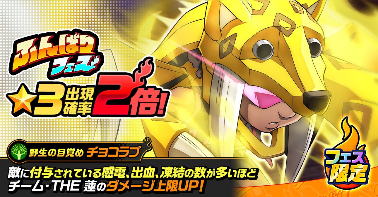 Studio Z株式会社(本社:東京都港区、代表取締役CEO:池幡賢)は、好評配信中のTVアニメ『SHAMAN KING(シャーマンキング)』を題材とした初のスマートフォン向けアプリゲーム『SHAMAN KING ふんばりクロニクル(通称:ふんクロ)』にて、★3の出現率が2倍のふんばりフェスを開催しております。新キャラ「[野生の目覚め] チョコラブ(CV: くまいもとこ)」が新たに登場している他、オパチョがメインとなるオリジナルイベントや、ログインボーナスも開催いたします。