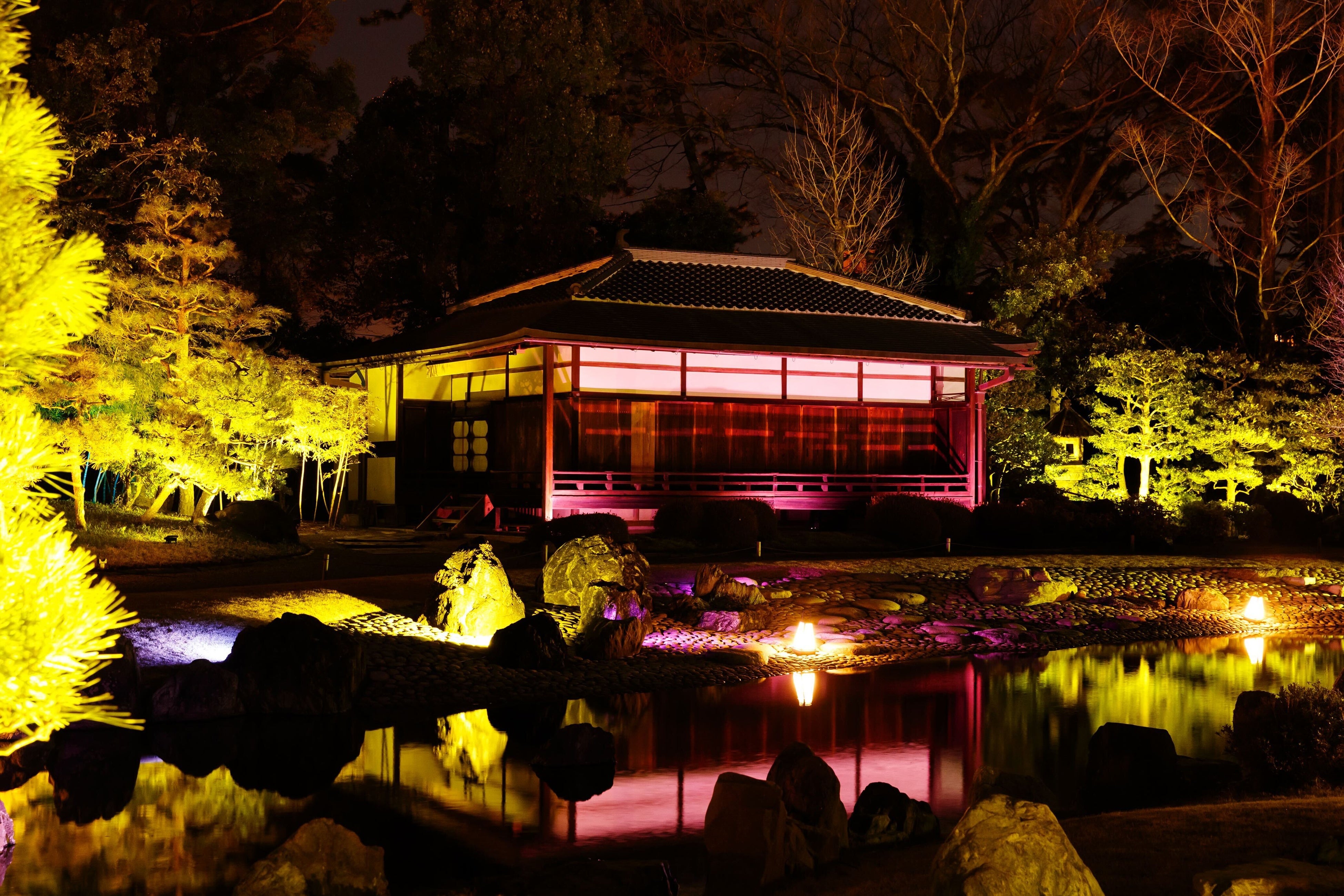桜、池、そして香雲亭が春の訪れをイメージした灯りに照らされ、桜色に染まるライトアップ。香雲亭が池に映り込む借景は春だけの勝景です。