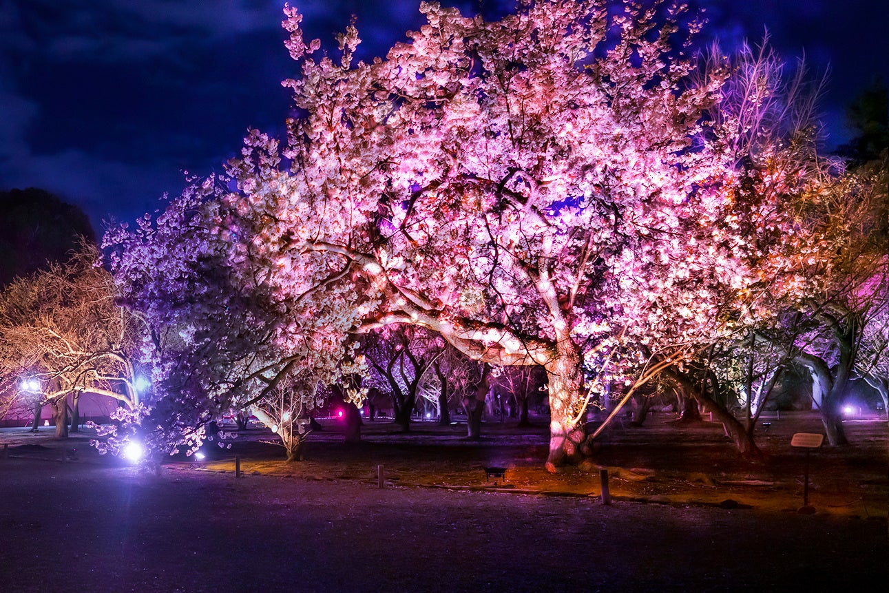 和楽器が奏でる優美な音楽とフローラルなアロマの香りに包まれる空間で、多様な品種の桜を楽しめるライトアップ。ライトアップの色が変化する演出とともに、その時だけの桜に出会えます。