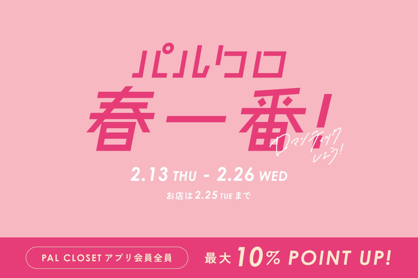 2月13日〜2月26日(お店は2月25日まで)の期間、パルグループの各店舗&パルクローゼットオンラインストアにて『パルクロ春一番』を開催いたします。