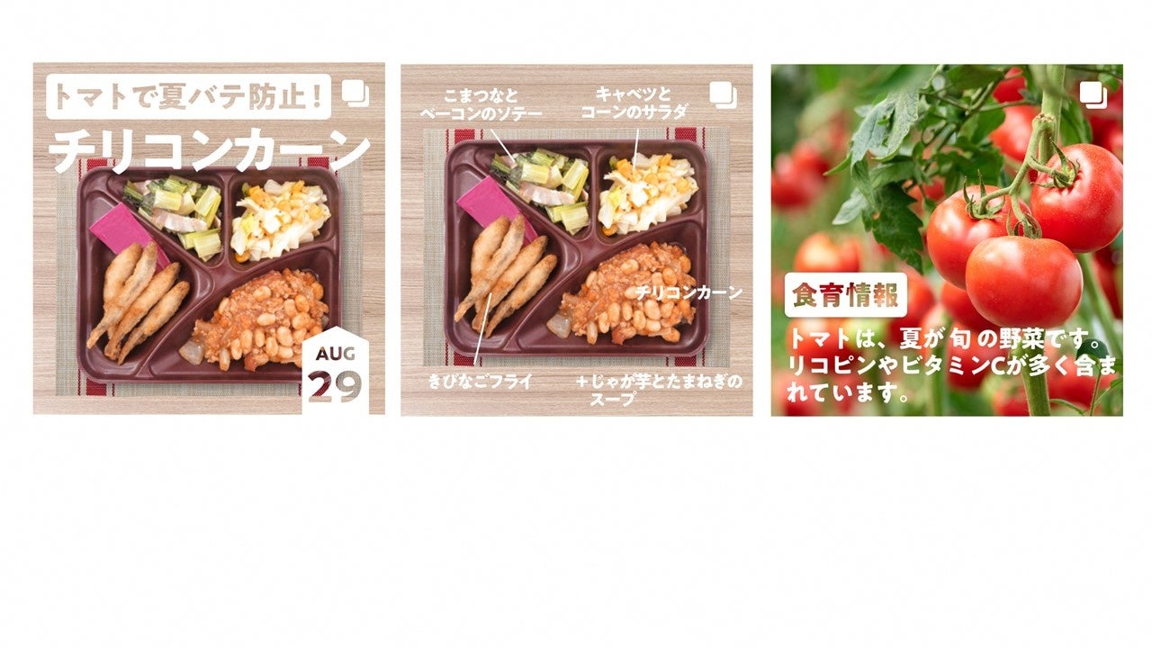 8月に開設した公式Instagramを通して中学校給食の献立の紹介、栄養士などによる食育動画、食の豆知識など、中学校給食に関するさまざまな魅力をお届けします。
