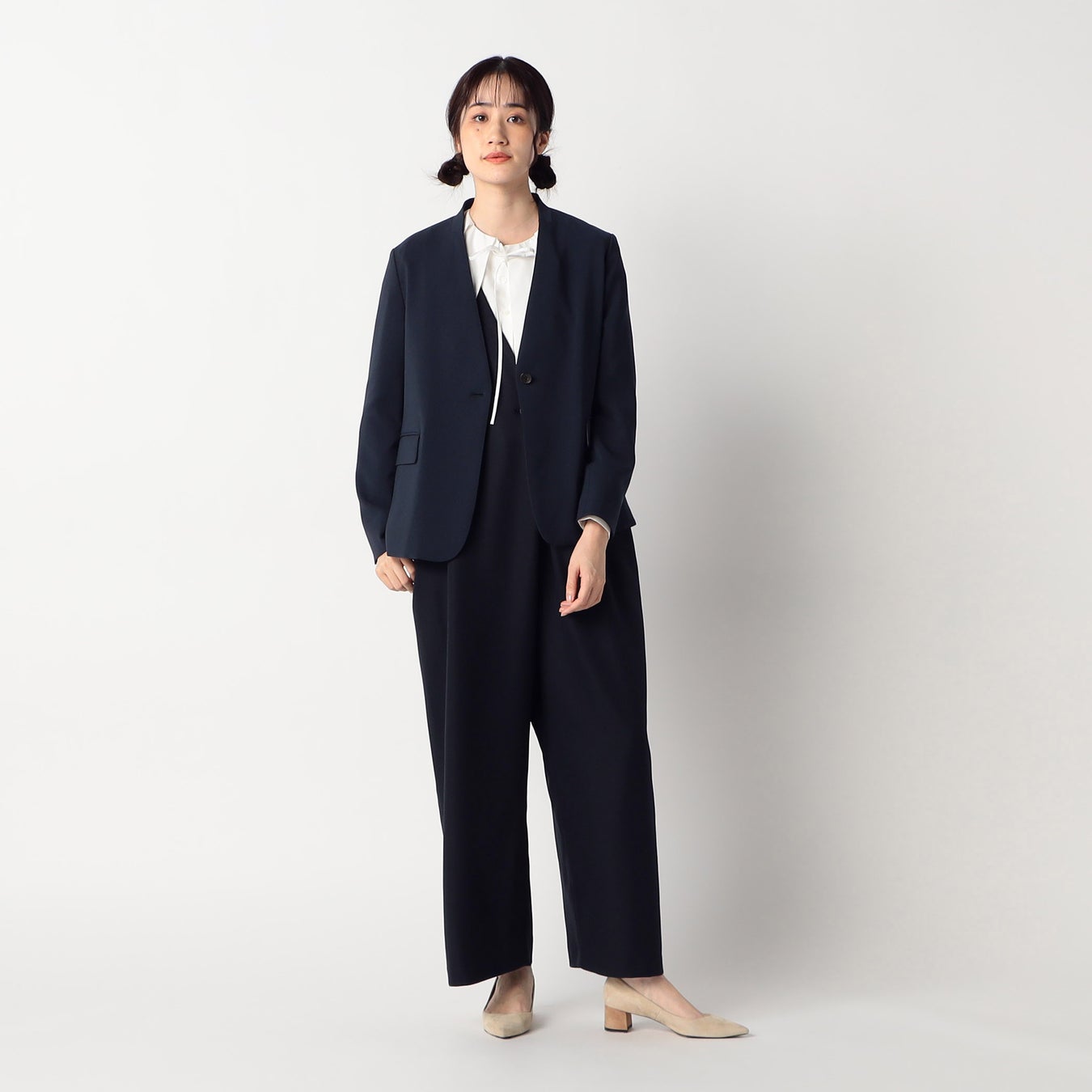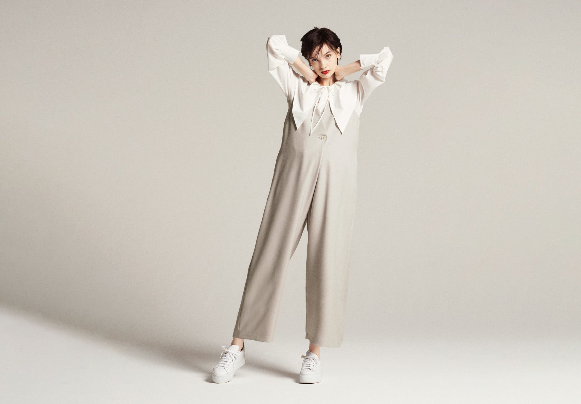 妊娠中もスマートでハンサムな着こなしを叶えたいと考え、すっきりとしたシルエットのサロペットをつくりました。ビッグカラーの甘めなブラウスを合わせると、今年らしい旬なスタイリングが完成します。産前はもちろんのこと、産後にも活躍するアイテムです。