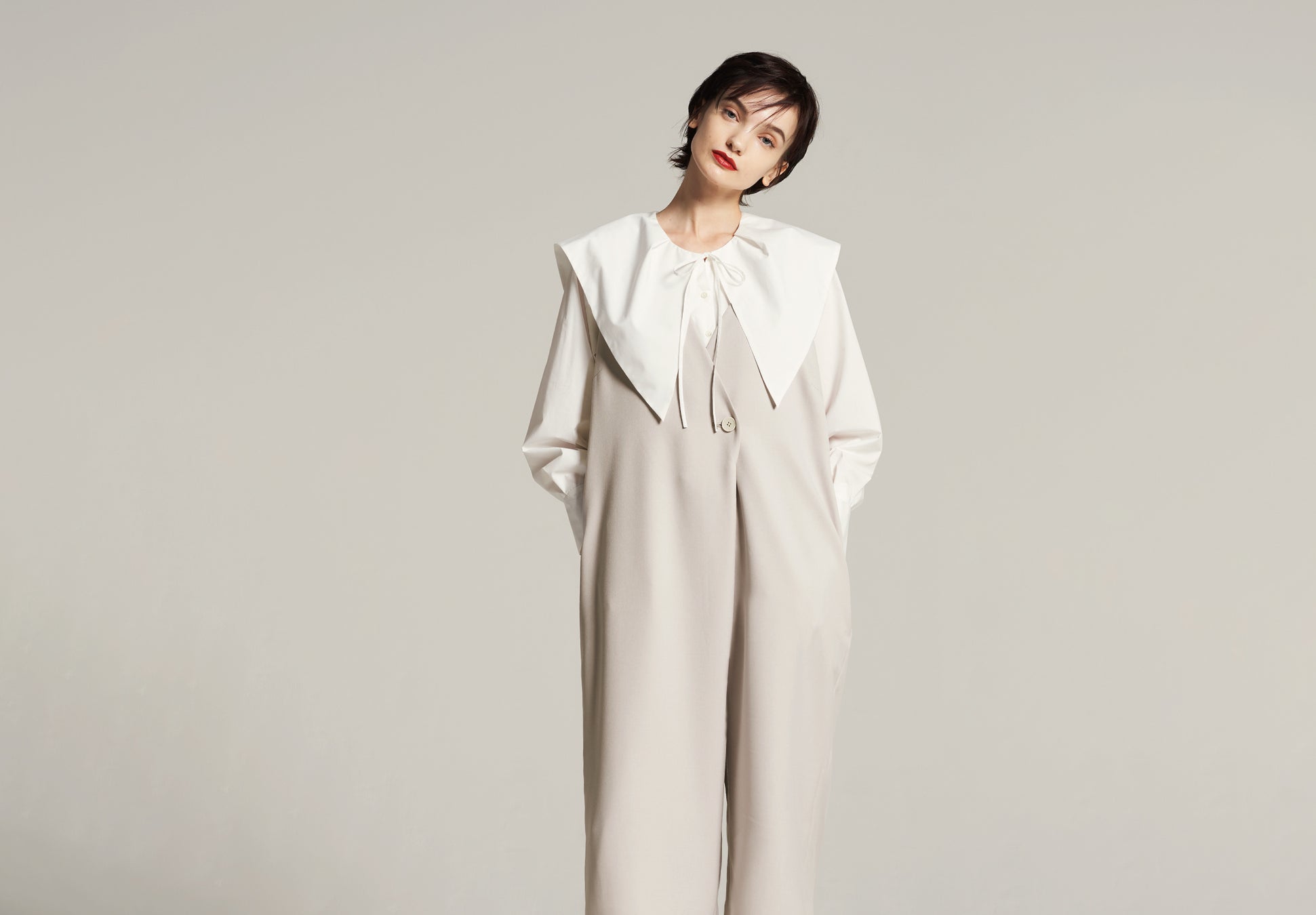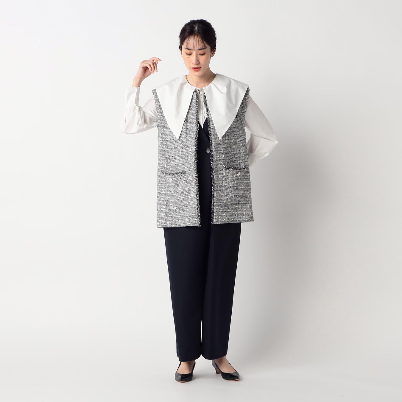 ・前後2WAYで着用でき、サロペットやカーディガンから襟を出すと、顔周りが華やかになります。