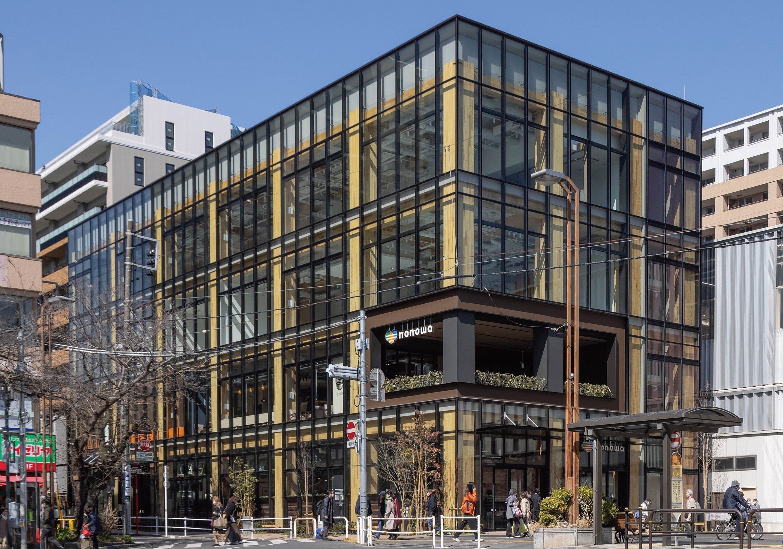 ■【nonowa国立SOUTH】は、JR中央線国立駅直結の木造商業施設で、景観やまちづくりの取組みに力を入れる文教都市・国立という立地に相応しい建築を目指しました。ガラス越しに木の架構を積極的に魅せる外観は、周囲に木材の活用を一目で伝えるだけでなく、木造旧駅舎を中心とした駅前の景観に豊かさを加えています。また、内部は木の架構が大らかな秩序を創り出し、地域の木材の多摩産材杉を積極的に採用することで、利用者が木に親しみを感じられる空間をデザインしました。