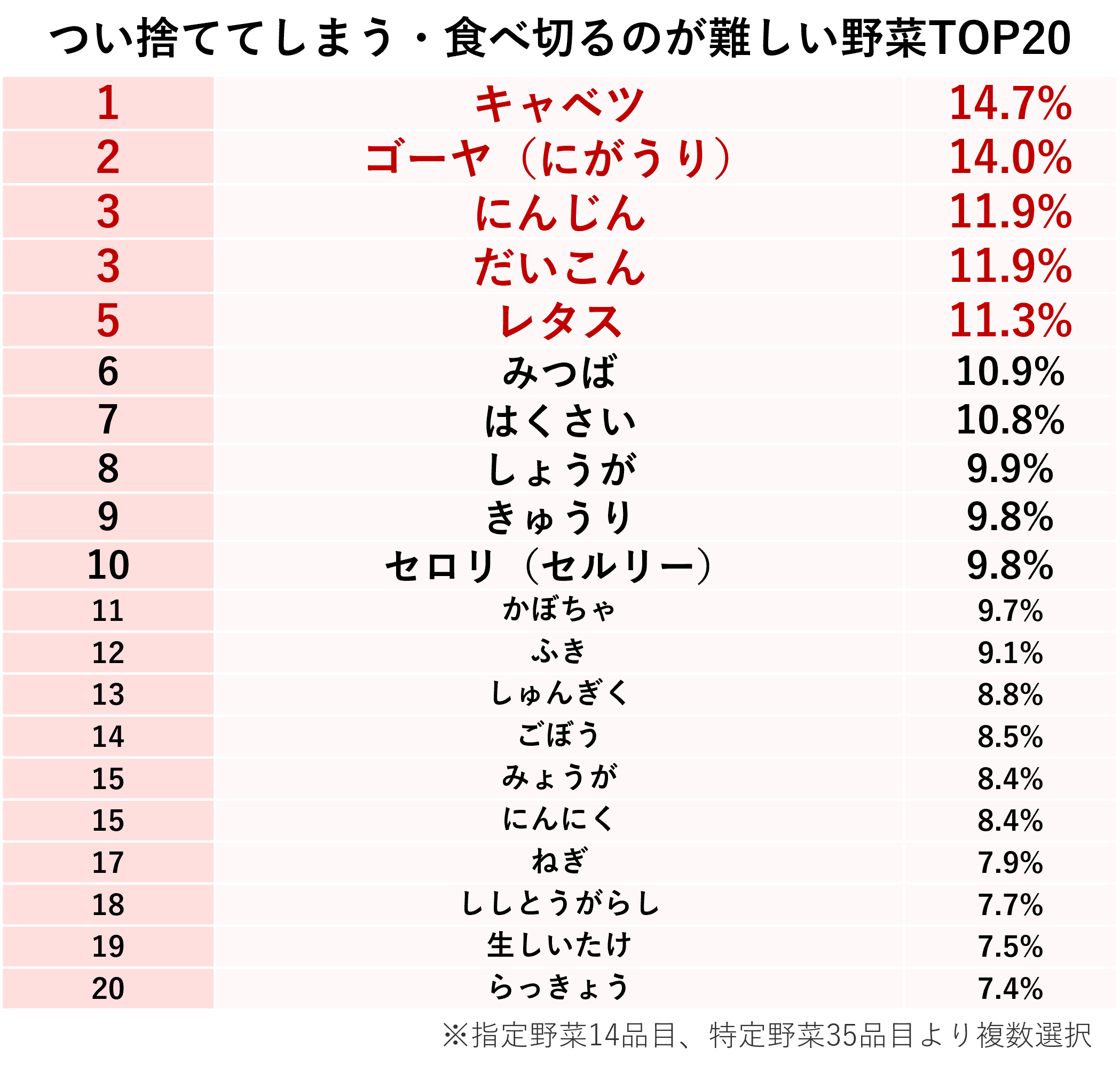 悔しかったエピソードにもあった通り、1つが大きいキャベツや大根、1袋に複数本が入っているにんじんは使い切ることが難しいと感じる人が多いようです。また2位の「ゴーヤ」は、6位の「みつば」10位「セロリ(セルリー)」と同様に、レシピが限られる印象が強いことからランクインしていると考えられます。