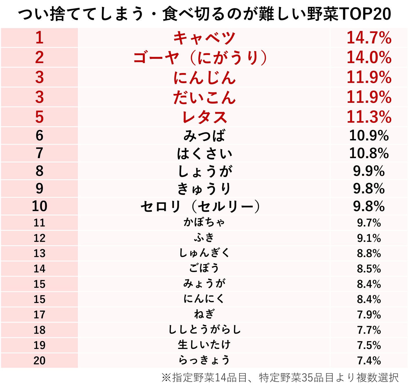 「つい捨ててしまう・食べ切るのが難しい食品・食材」の中で1位になった「野菜・果物」について、さらに具体的に聞きました。農林水産省が定めた指定野菜14品目、指定野菜に準ずる重要な野菜として定められた特定野菜35品目の中から、「つい捨ててしまう・食べ切るのが難しい野菜」を複数選択で聞きました。結果は、1位から順に「キャベツ」14.7%、「ゴーヤ(にがうり)」14.0%、「にんじん」11.9%、「だいこん」11.9%となりました。