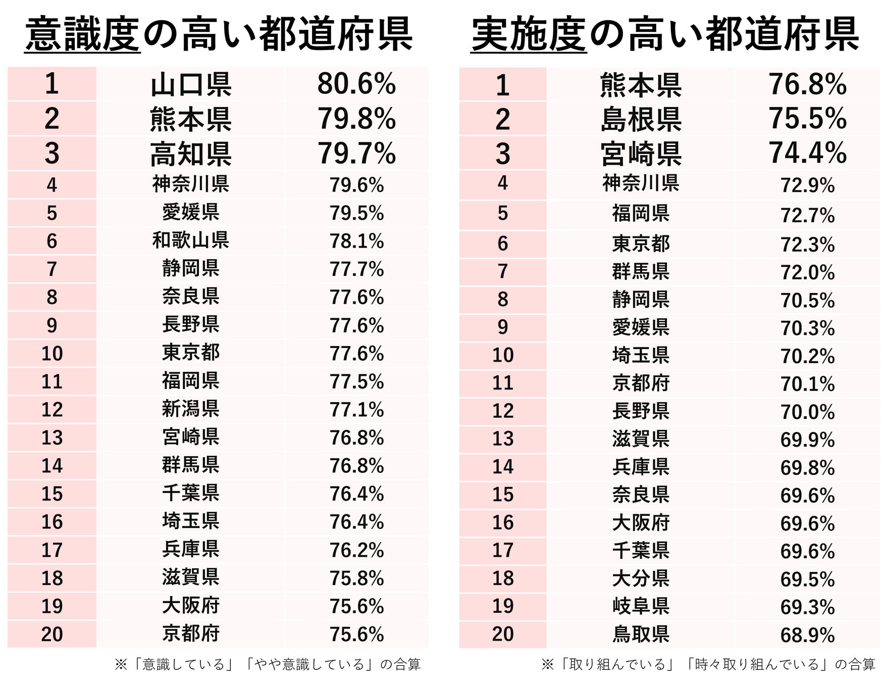 東日本エリアでは首都圏が多く、意識度では上位20位にランクインした東日本8都県のうち首都圏が5都県(神奈川県、東京都、群馬県、千葉県、埼玉県)、実施度では7都県のうち5都県(神奈川県、東京都、群馬県、埼玉県、千葉県)でした。東日本のトップは共に神奈川県で、どちらも4位でした。