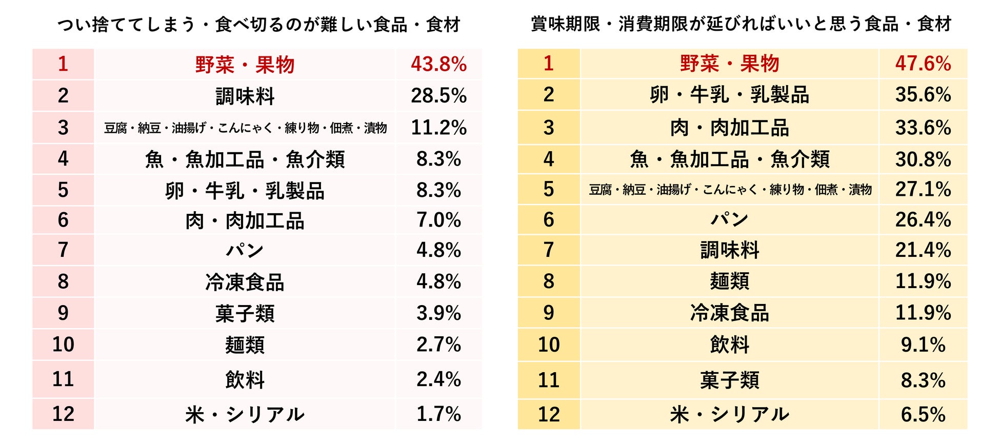 ■ フードロスしがちなもの、期限が延びて欲しいもの、共に「野菜・果物」が1位