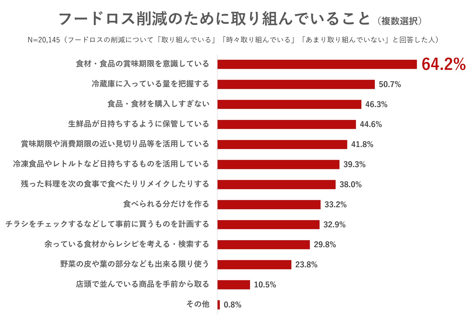 続いて、フードロス削減の取り組みをしている人を対象に、実際に何に取り組んでいるのかを聞きました。1位は「食材・食品の賞味期限を意識している」の64.2%で、2位と10ポイント以上の差をつけトップになりました。2位は「冷蔵庫に入っている量を把握する」の50.7%、3位は「食品・食材を購入しすぎない」の46.3%となりました。