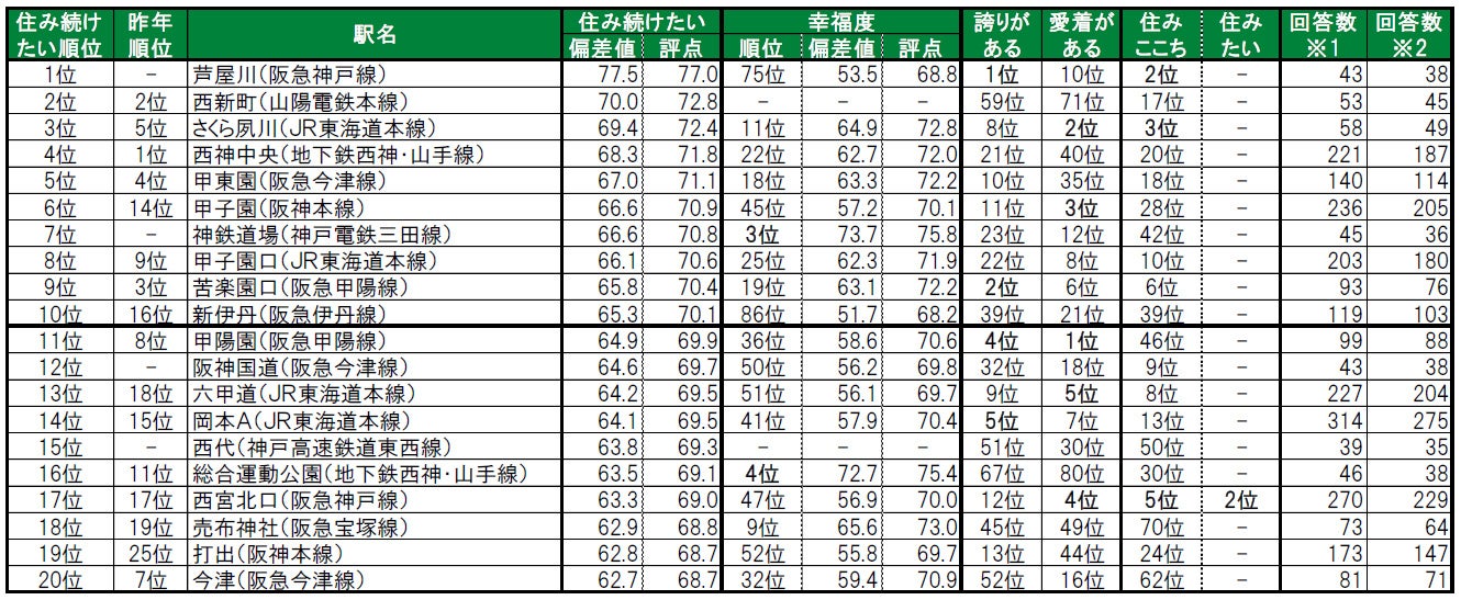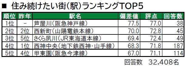 1位は、「住み続けたい街(自治体)」で1位の芦屋市に位置する芦屋川です。同駅は、昨年は累計回答数が30名未満でランキング集計対象外でした。2位は、2年連続で明石市に位置する西新町です。3位は「住み続けたい街(自治体)」で2位の西宮市に位置するさくら夙川で、「街に愛着がある」2位、「住みここち」3位の駅です。