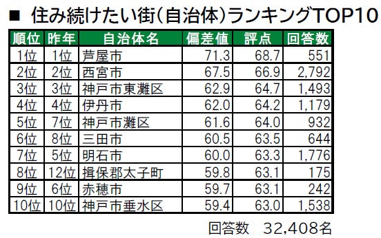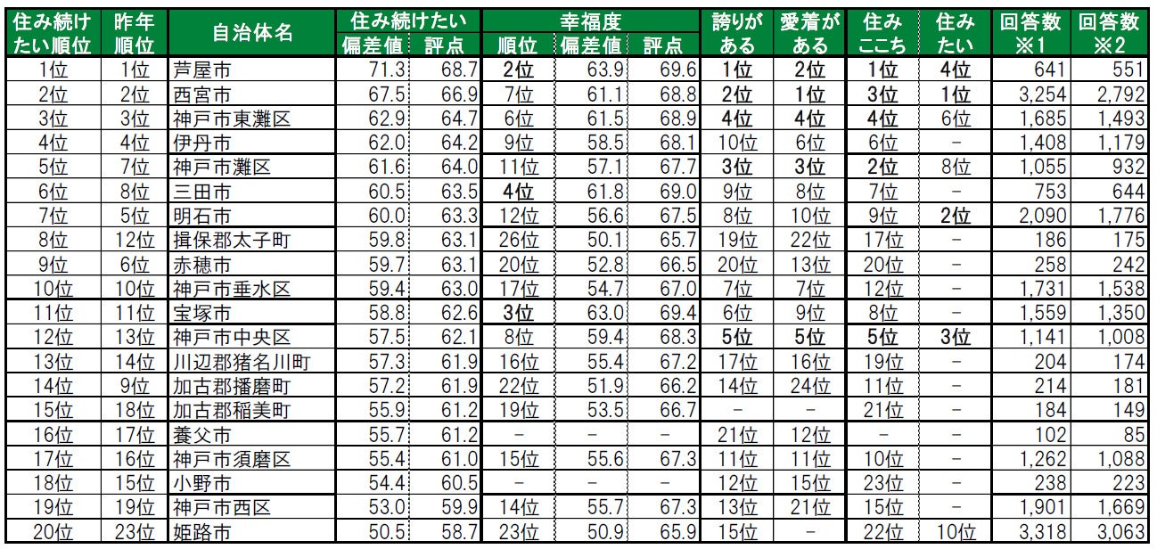 いい部屋ネット「街の幸福度 & 住み続けたい街ランキング2023<兵庫県版>」(街の住みここちランキング特別集計)発表