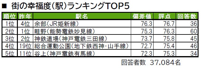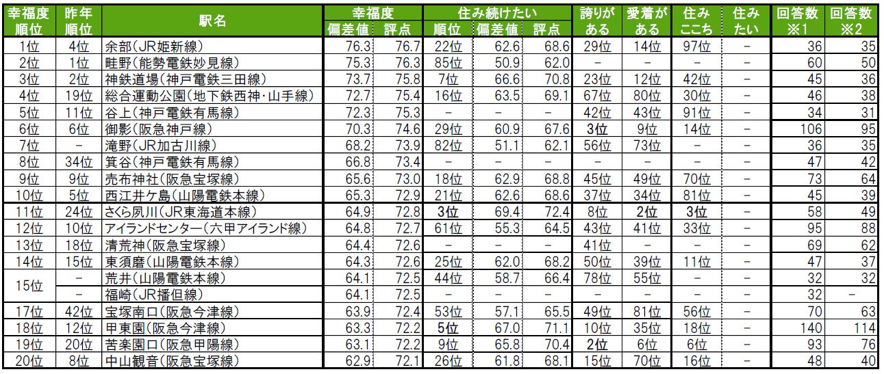 ●トップ10に入っている駅のうち5駅は、「街の幸福度(自治体)」でトップ10に入っている自治体に位置する駅(神戸市北区・神戸市東灘区・宝塚市)です。