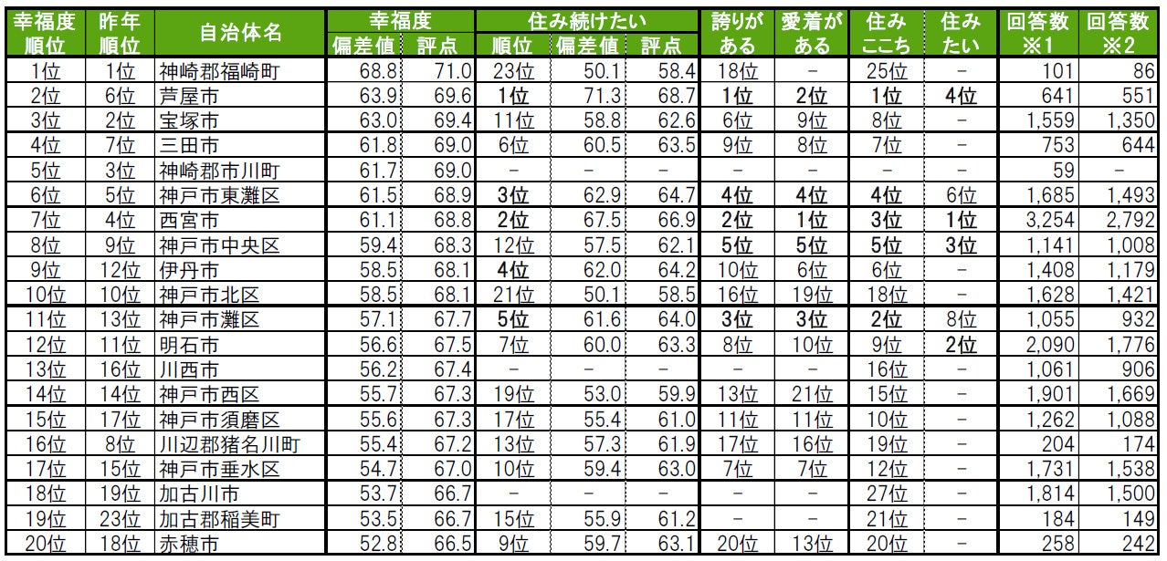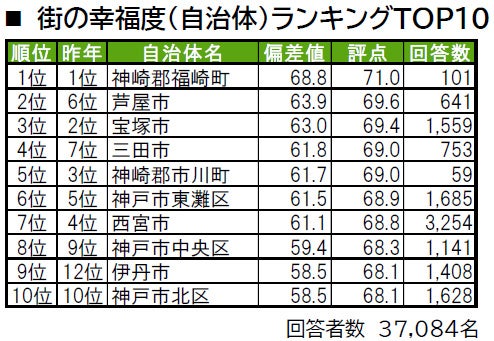 ■街の幸福度(自治体)トップは、2年連続で神崎郡福崎町