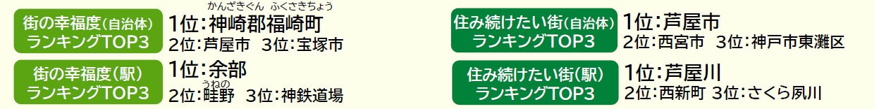1位は2年連続で神崎郡福崎町で、「街の幸福度<関西版>」では2年連続で3位の高い評価を得ています。2位は芦屋市で、「住みここち」「住み続けたい街」「街に誇りがある」の3つで1位、「街に愛着がある」2位、「住みたい街」4位と、全てのランキングでトップ4以内に入る高い評価を得ています。3位は宝塚市となっています。