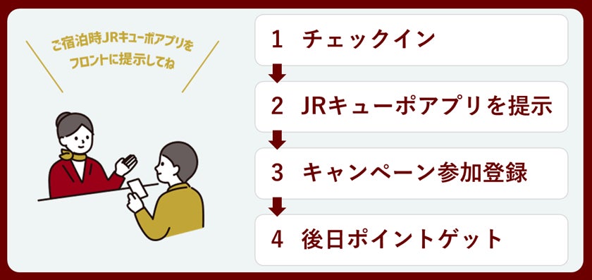 期間中、対象ホテルにご宿泊の際、フロントでJR キューポアプリをご提示のうえ参加登録をされたお客さま(代表者さま)に、1チェックインあたりJR キューポ100 ポイントをもれなくプレゼント