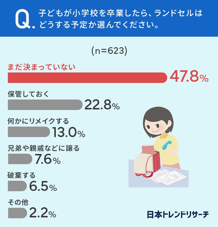 半数以上の方が、子どもが小学生を卒業したらランドセルはどうする予定か決まっているようです。