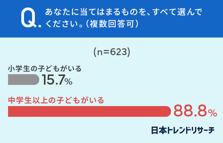 15.7%の方が「小学生の子どもがいる」、88.8%の方が「中学生以上の子どもがいる」と回答しています。