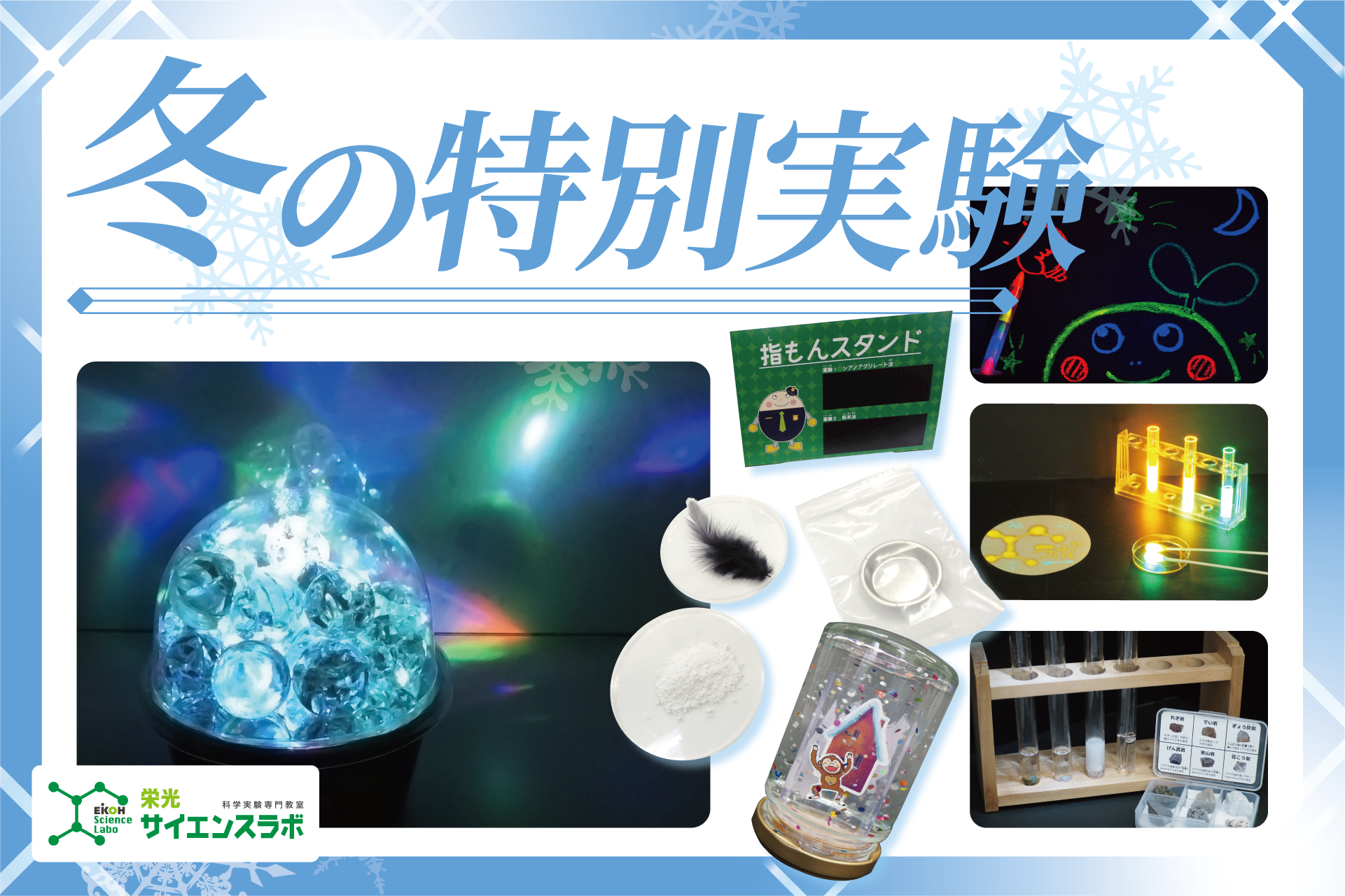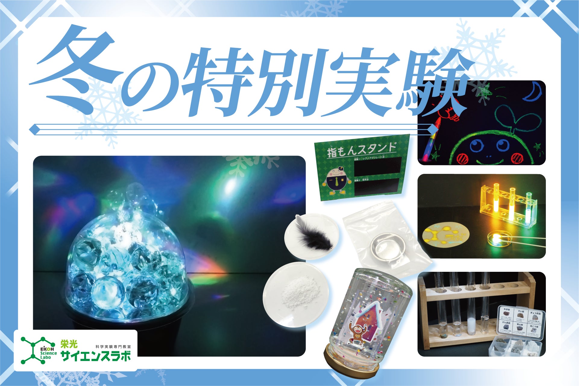 科学実験専門教室「栄光サイエンスラボ」では2023年12月~2024年1月まで、年中~小学6年生を対象に、「冬の特別実験」を開講します。お子さまの好奇心・探究心を刺激する、対面講座・映像講座をあわせて全11講座を用意しました。映像講座では事前にキットをお送りし、映像を見ながら自宅で実験します。対面講座の多くで、使用したキットや作成したものを持ち帰りできます。普段、栄光サイエンスラボにお通いでない方も参加可能です。