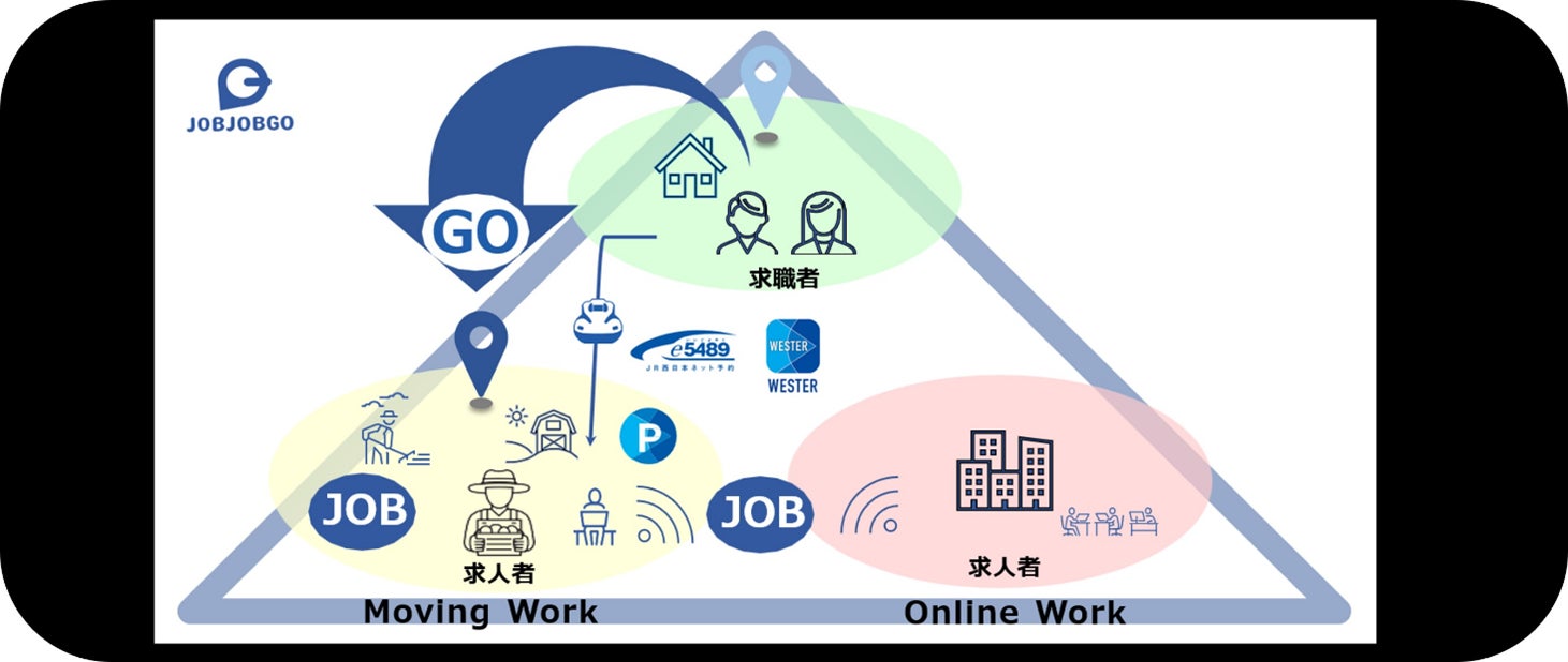 JR西日本がもつ鉄道ネットワーク・グループ共通ポイント「WESTERポイント」と、JR西日本キャリアの豊富な人材プールを活用し、「Moving Work(※1)」と、「Online Work(※2)」をかけ合わせて提案することで『新しい働き方』と『新たな移動』を創出することを通じ、JR西日本グループとして労働力不足という社会課題の解決と地域の活性化を図ります。