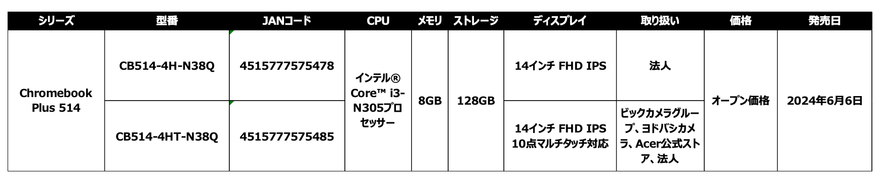 日本エイサー株式会社(本社:東京都新宿区、代表取締役社長:ボブ・セン)は、起動もインターネット接続もスピーディーで、軽量で高速、そしてセキュリティに優れた ChromeOS を搭載した、日本エイサーとしては初の Chromebook Plus の新モデル「CB514-4HT-N38Q」「CB514-4H-N38Q」の2機種を、本日2024年6月26日(水)より販売します。「CB514-4HT-N38Q」は、ビックカメラグループ、ヨドバシカメラ、Amazon、Acer公式オンラインストア、Acer Direct楽天市場店、Acer Direct Yahoo!ショッピング店、法人のお客様へ※販売します。「CB514-4H-N38Q」は法人のお客様にのみ受注販売で販売します。