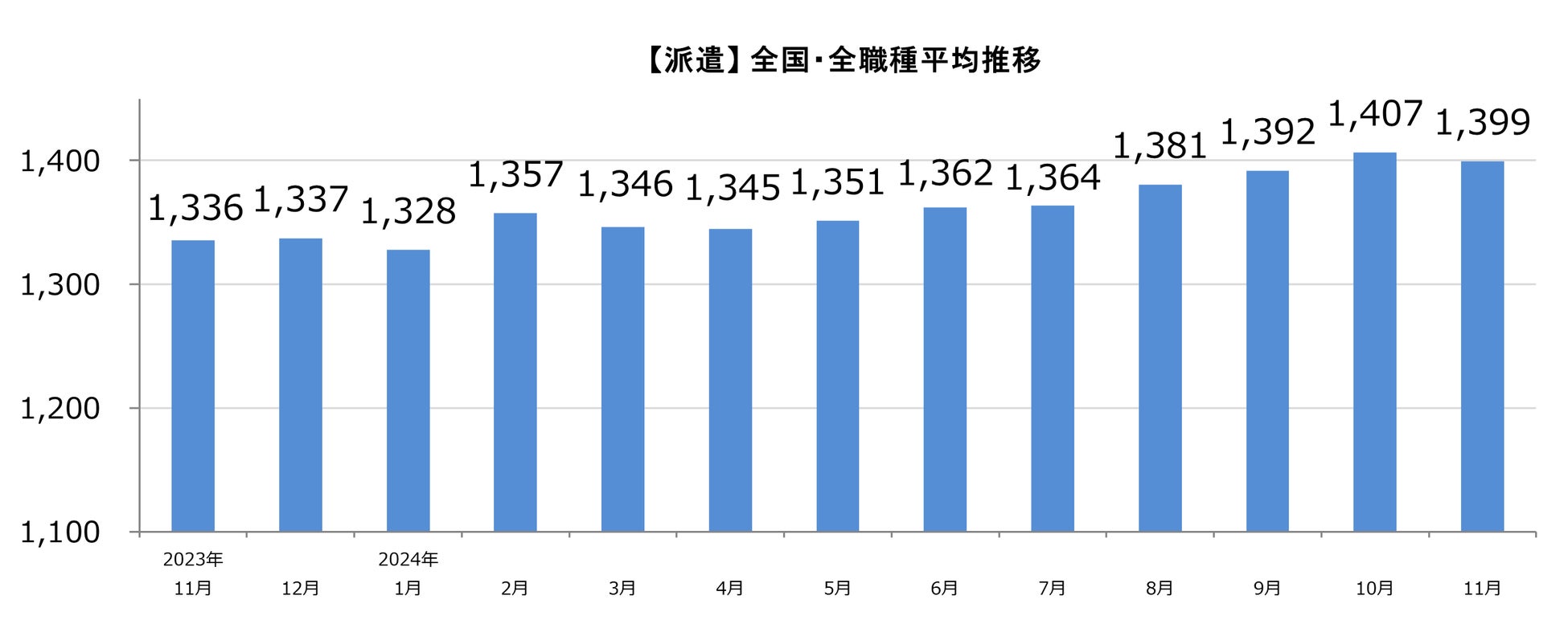 【派遣】全国・全職種平均時給は1,399円。前月比-8円。前年同月比+63円