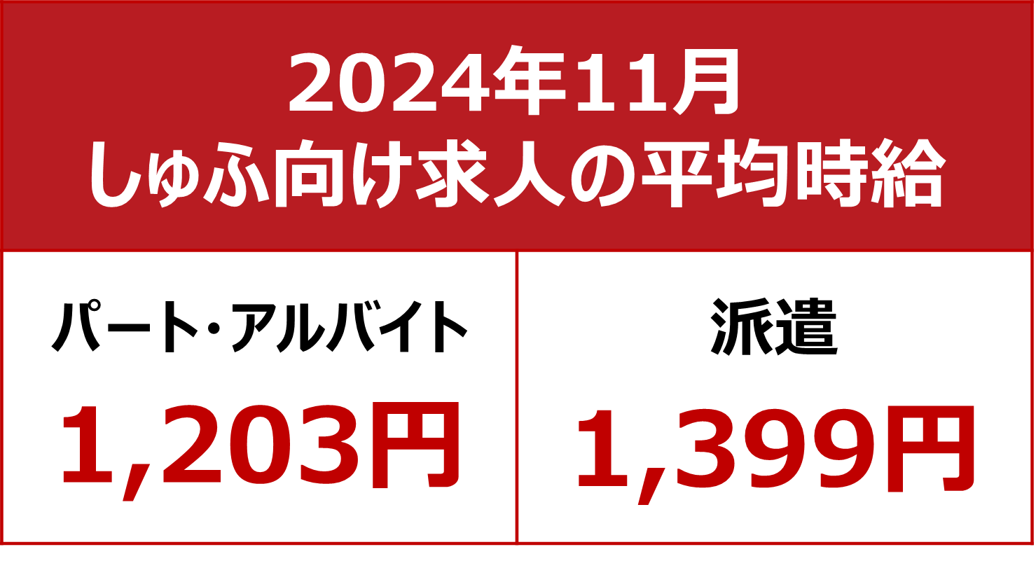 【2024年11月しゅふ求人の平均時給】パート・アルバイト:『1,203円』、派遣:『1,399円』/パート過去最高、初の1,200円超え