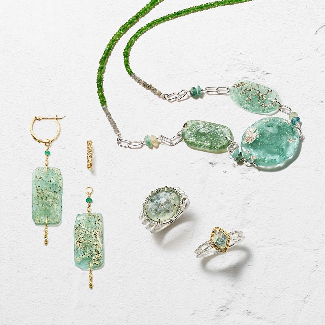 ローマ帝国で広く愛されたガラスが地中に眠りにつきジュエリーとして生まれ変わったローマングラスと、古来より崇められてきた神秘の宝石ターコイズのシリーズ。