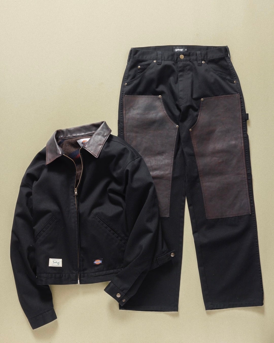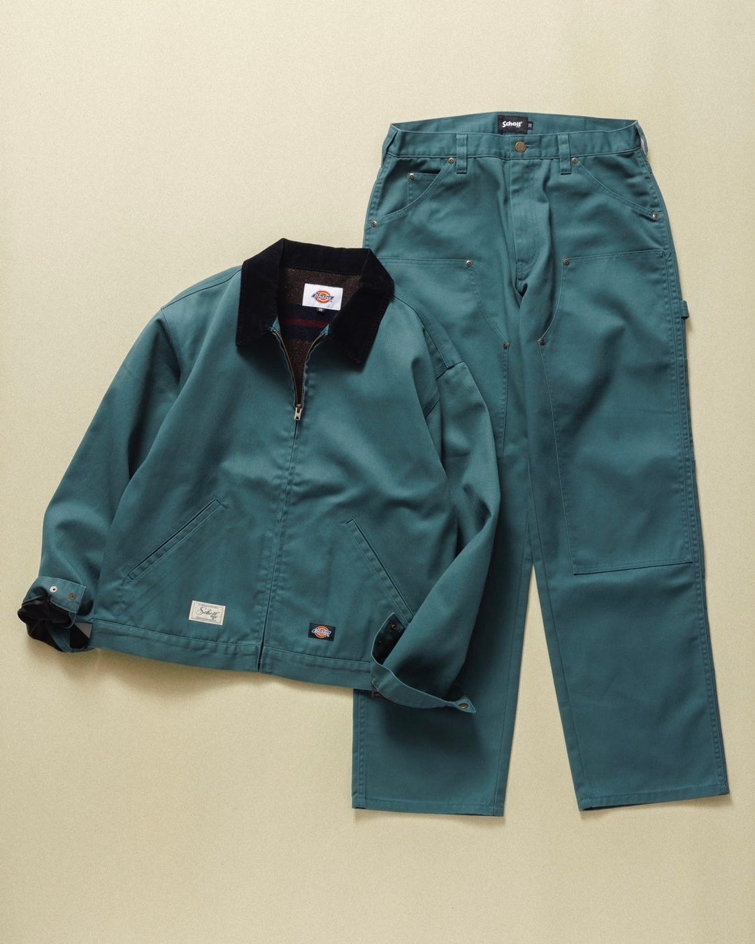 「Dickies®」の名作モデル「ダブルニー」にフォーカスし、それに合わせたワークジャケットのセットアップで、定番のTC素材に加え、スペシャルピースとして要所に茶芯のホースハイドパーツを使用したモデルを用意。
