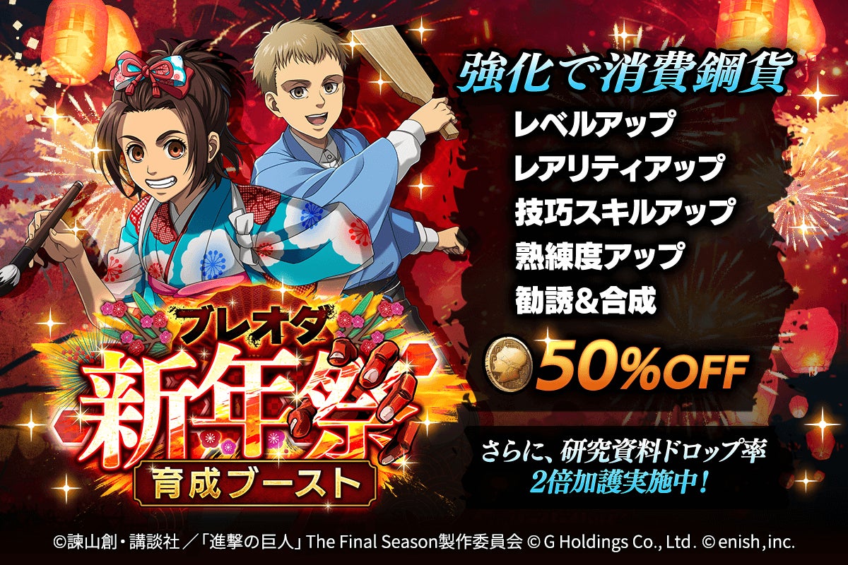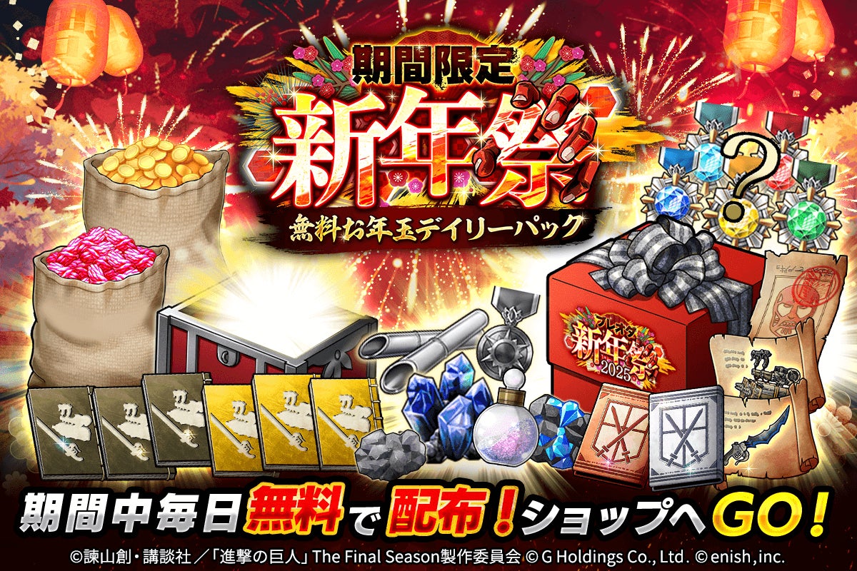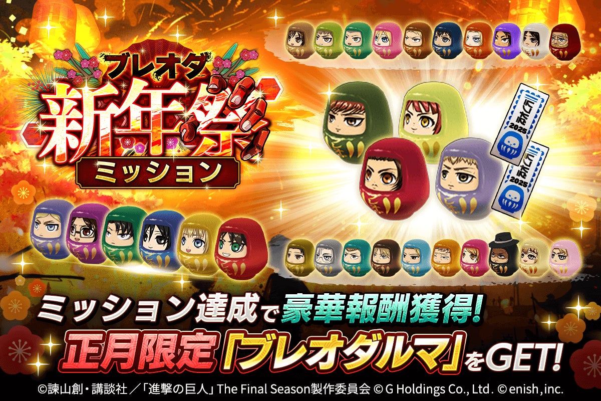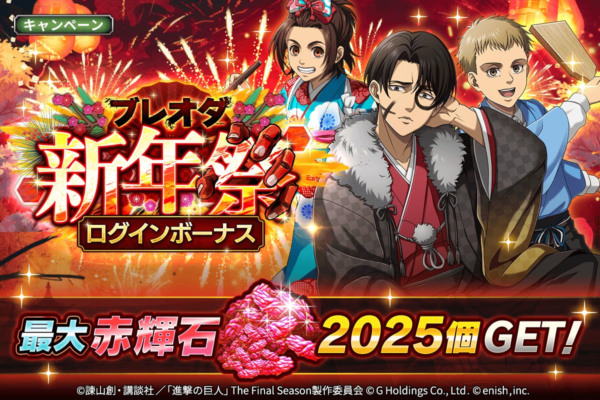 株式会社enish(本社:東京都港区、代表取締役社長:安徳 孝平、以下enish)は、アニメ『進撃の巨人』のスマートフォンゲーム最新作「進撃の巨人Brave Order」にて、2025年1月1日(水)より、ブレオダ新年祭を開催!本キャンペーンではガチャ等に使用可能な赤輝石が合計2025個もらえちゃうログインボーナスなどのお得なキャンペーンを多数開催!その他、最新情報はゲーム公式サイト・ゲーム公式X(旧Twitter)アカウントにて随時公開して行きますので、ぜひご覧ください。