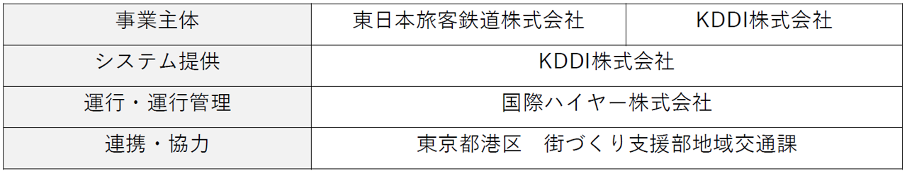 ・本実証運行は、AIオンデマンドシステム(※3)を活用し、高輪地区内を最適なルートで移動できる乗合サービスを試験導入します。JR東日本が培ってきた地域とのネットワークとKDDIのデジタル力を連携し、さらに国際ハイヤーが利用者の快適な移動をサポートします。