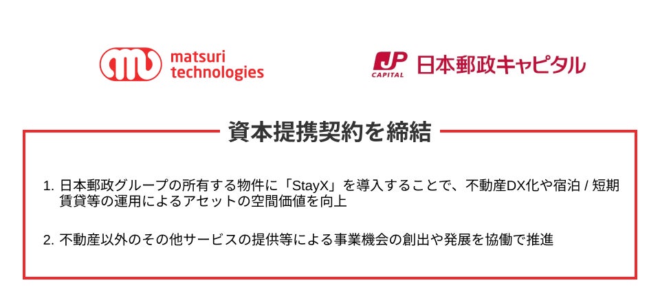 ソフトウェアを主軸に、空間の価値を最大化するソリューション「StayX」を運営するmatsuri technologies株式会社(本社:東京都新宿区)は、日本郵政キャピタル株式会社(本社:東京都千代田区、代表取締役:丸田 俊也、以下日本郵政キャピタル社)と資本提携したことをお知らせいたします。
