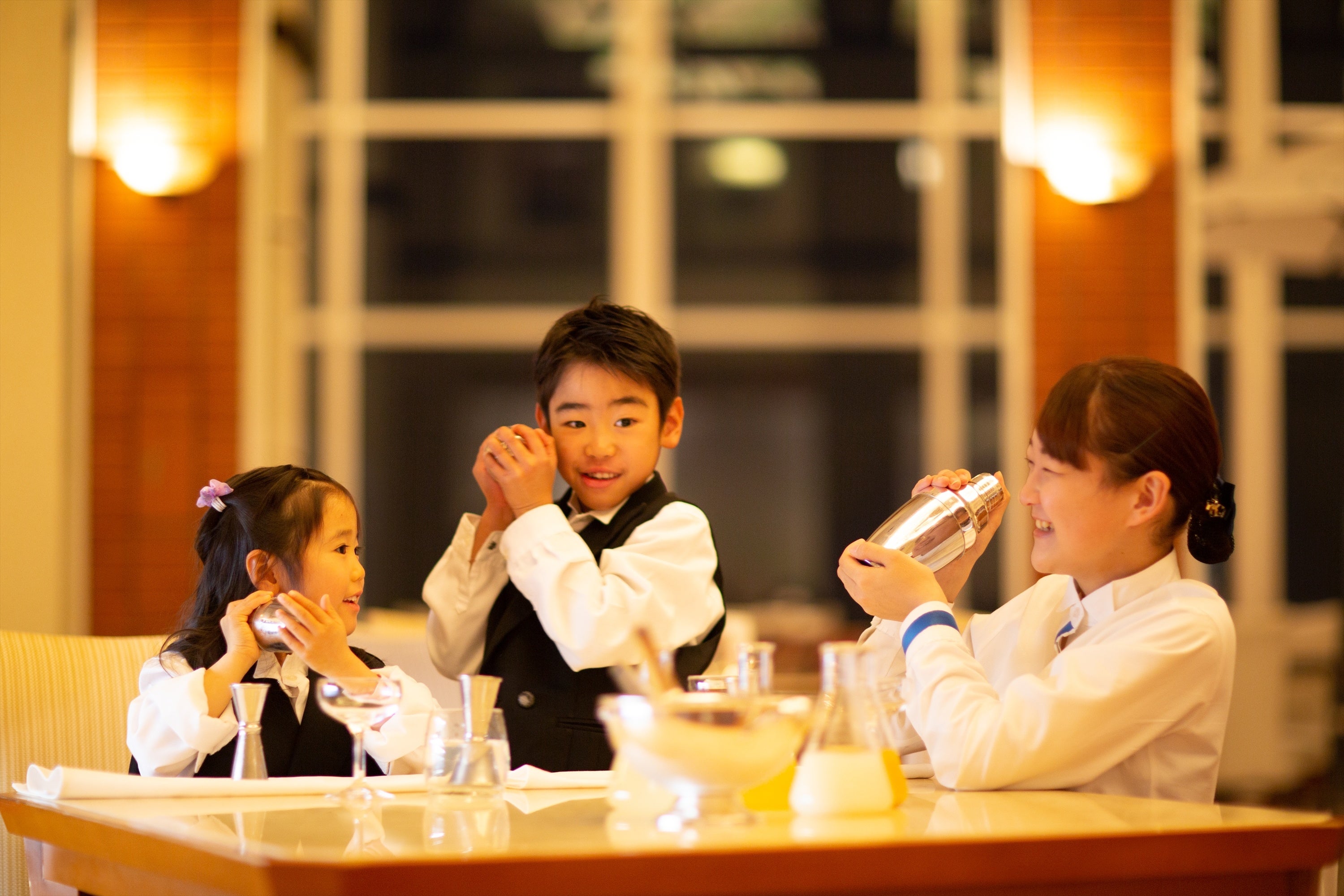リゾートホテルのお仕事をすることで、スタッフやお客さまとふれあい、学びながら楽しむプログラム。ユニフォームに着替えて、ベルスタッフやパティシエ、バーテンダー、ショップスタッフなど、様々な職種を体験できます。