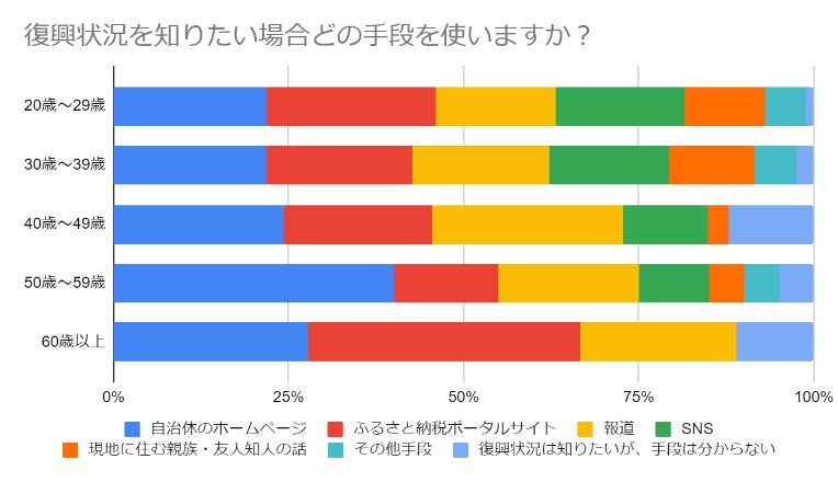 ◆ ふるさと納税で寄付した自治体の復興状況について知りたいと思う人の割合が多い世代は30代が最多で96.9%、次いで20代が94.6%だった。どのような手段を使って情報収集するかを尋ねたところ、20代、30代は他の世代に比べてSNSや現地に住む親族・友人知人の話など、個人的なエピソードを知ることのできる手段を選ぶことが分かった。