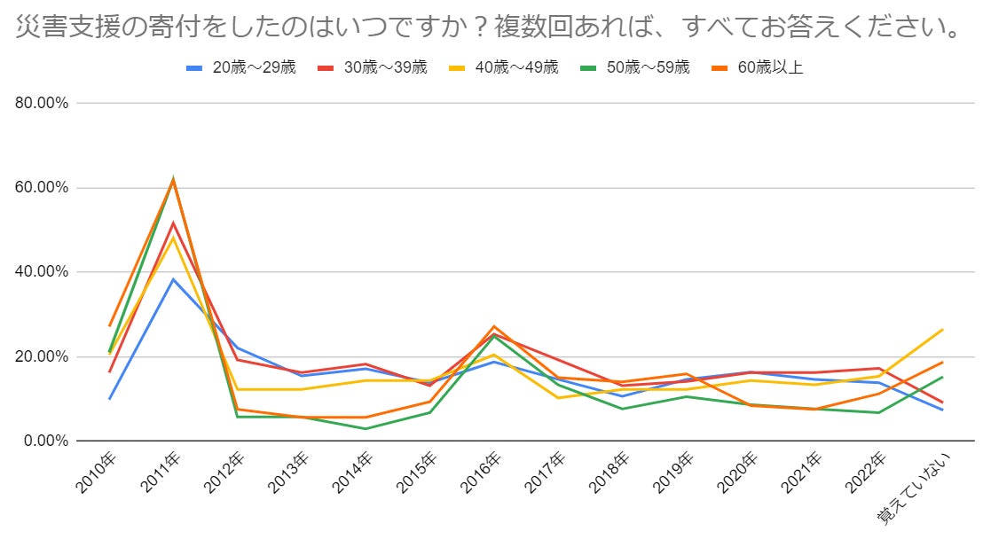 4) いずれの年代でも、2010年以降寄付した年で最も多いのは東日本大震災の起きた2011年。40代以上は、大きな災害が起きた年に寄付する傾向があった。一方、20代と30代は各年での寄付経験の分布に比較的ばらつきがなかったため、災害の規模にかかわらず例年継続して寄付する傾向が見て取れる。