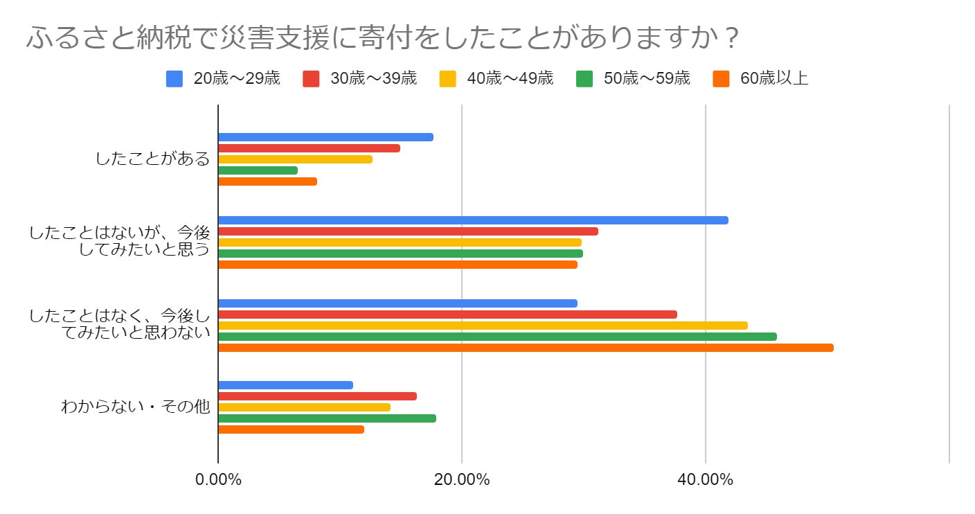 6) ふるさと納税での災害支援に好意的な意見が最も多かったのは20代。ふるさと納税で災害支援に寄付したことがあると回答した20代の割合(17.6%)と、ふるさと納税で災害支援に寄付したことはないが、今後してみたいと回答した20代の割合(41.9%)が、他の世代と比べ最も高かった(20代の合計59.5%)。続く30代では合計46.1%、次に40代の合計42.4%だった。
