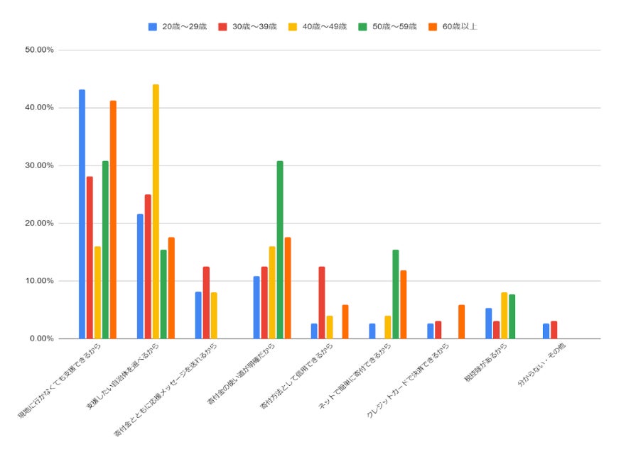 5) 20代は旅行やふるさと納税などその地域との関わりが寄付の動機になっている傾向が他の世代と比べ顕著で、20代では最も多かった回答が「仕事や旅行などで寄付先に行ったことがあるから」(34.1%)、次いで「寄付先にふるさと納税をしたことがあるから」(25.2%)となり、他の全世代の最も多かった回答が「関わりはないが、支援したいと思ったから」であったことと対照的な結果となった。