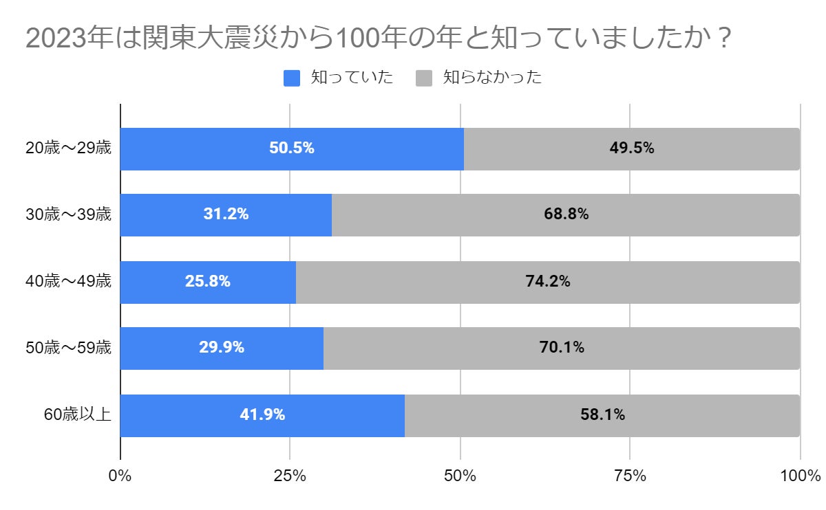 ◆ 今年が関東大震災から100年と知っていた割合が最も高かったのは20代(50.5%)で、過半数を超えた唯一の世代となった。